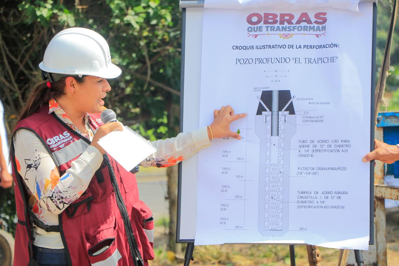 La secretaria de Infraestructura, Desarrollo Urbano y Movilidad (Seidum), Marisol Neri León, realizó la explicación de la obra que responde a una gran necesidad de la población, con la construcción de la perforación y el aforo del pozo que tendrá 260 metros de profundidad y se hace con combinación de recursos pertenecientes al Programa de Agua Potable, Drenaje y Tratamiento (Proagua) y el Fondo de Infraestructura Social para las Entidades (FISE), que suman alrededor de 4 millones 600 mil pesos.