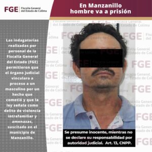 Las indagatorias realizadas por personal de la Fiscalía General del Estado (FGE) permitieron que el órgano judicial vinculara a proceso a un masculino por un hecho que cometió y que la ley señala como delito de violencia intrafamiliar y amenazas, suscitado en el municipio de Manzanillo.