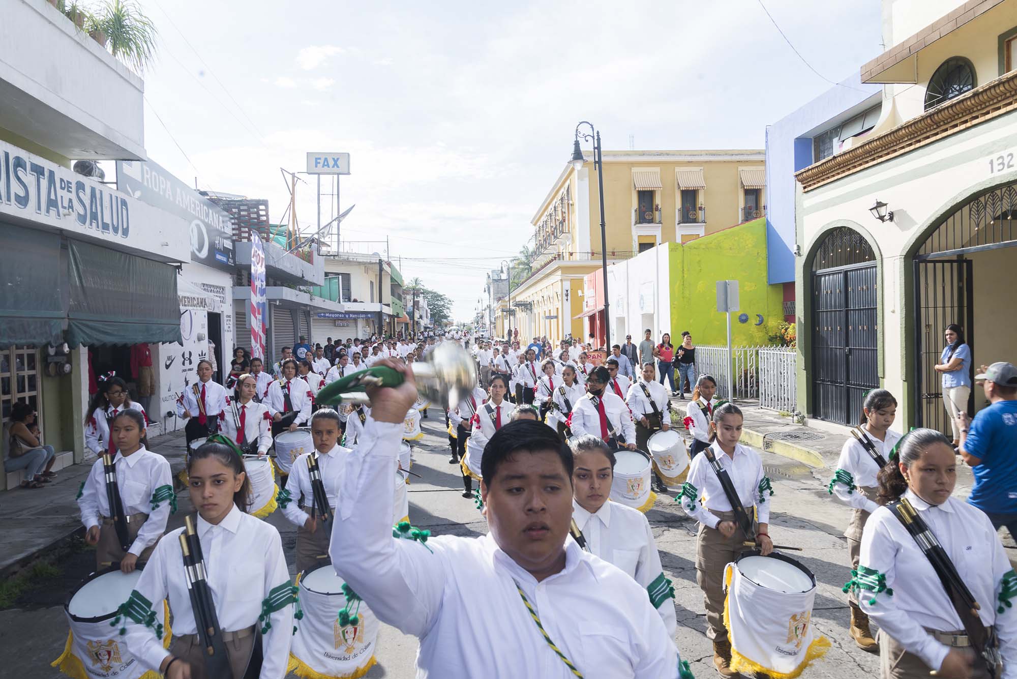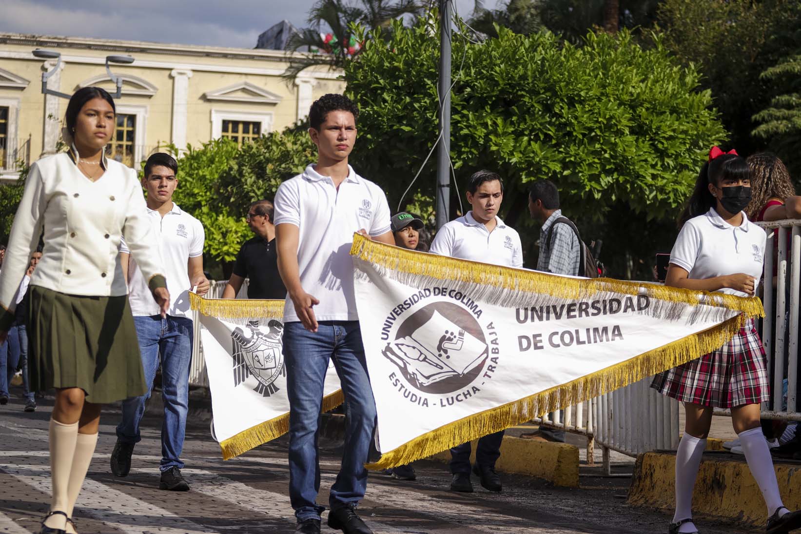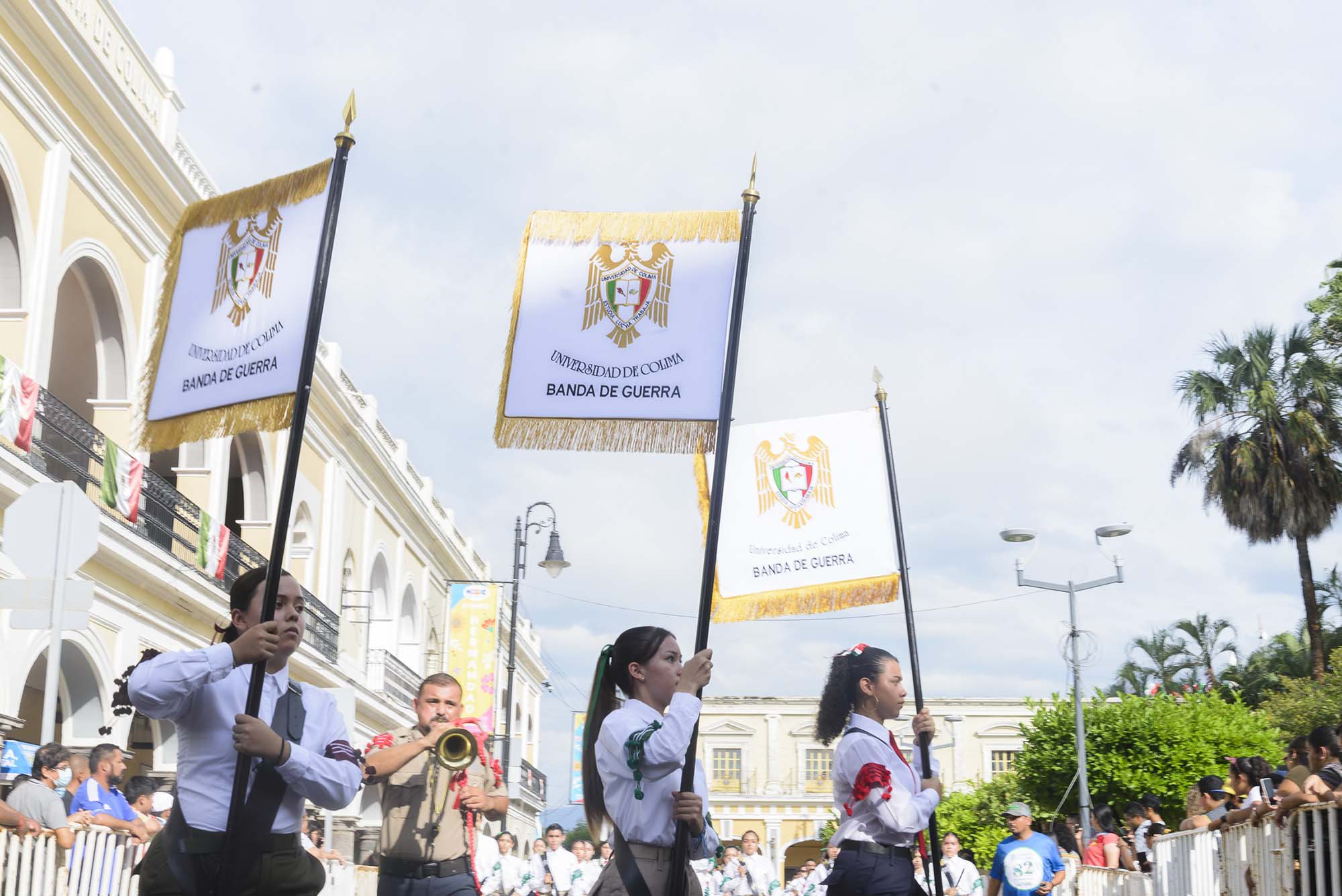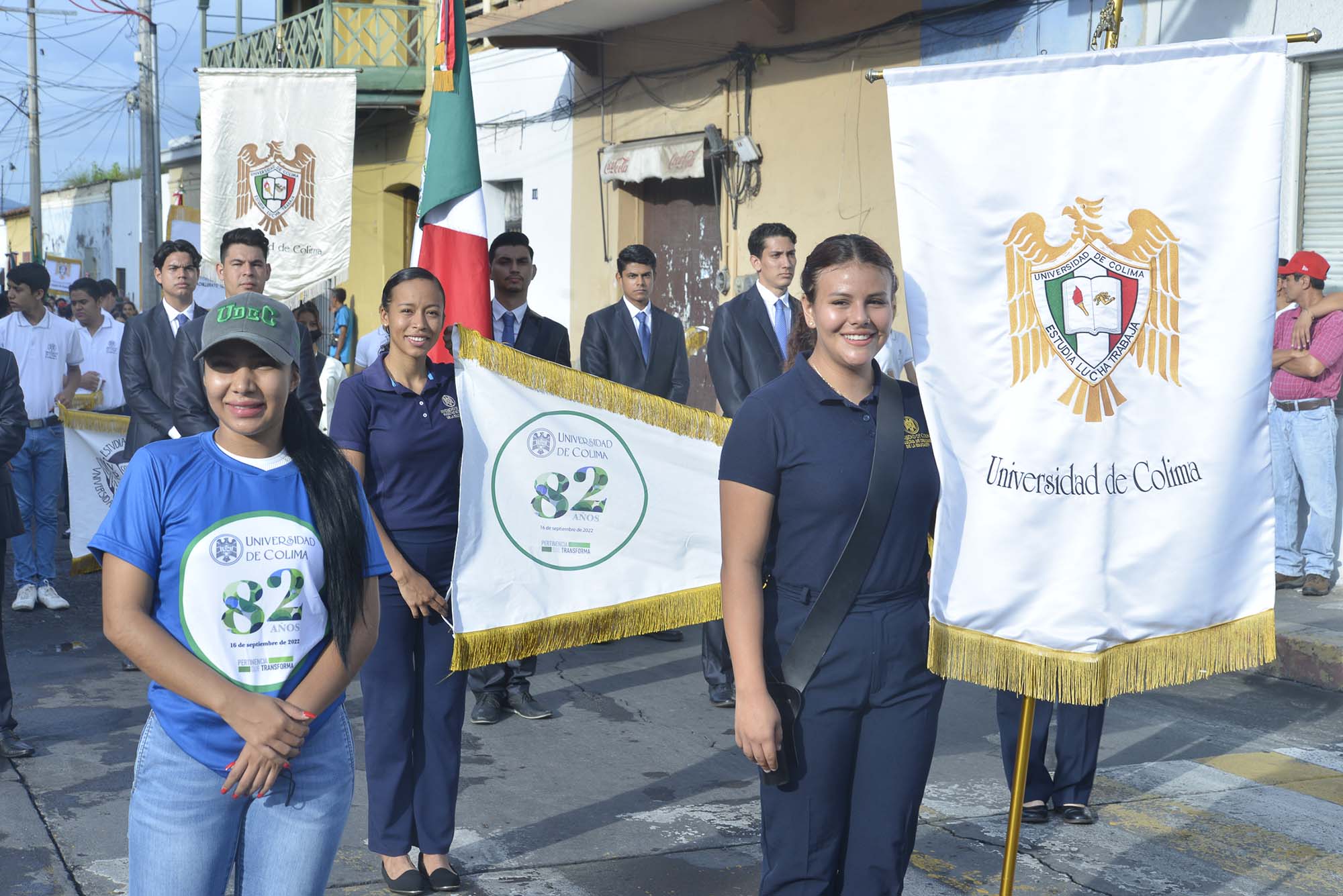 Desfilaron bandas de guerra y escoltas en representación de una comunidad de cerca de 29 mil estudiantes y de alrededor de 4 mil trabajadores, este viernes en el que la casa de estudios cumple 82 años de vida formando a las y los jóvenes colimenses y apoyando el desarrollo económico, cultural, científico y social del estado y la región.