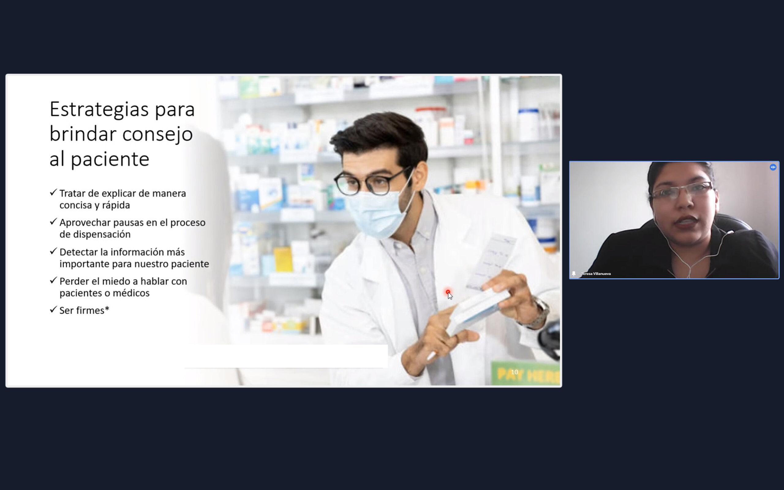 En su charla “Farmacias comunitarias: un espacio para realizar intervenciones farmacéuticas”, María Teresa Villanueva dijo que las y los farmacéuticos son quienes se aseguran de que un medicamento sea seguro, efectivo y eficiente mediante la revisión de la preinscripción. Además, deben asegurarse de que el producto no sea falsificado; esto es, que el proveedor cumpla con los requerimientos sanitarios y el producto esté 100 por ciento aprobado para su venta.
