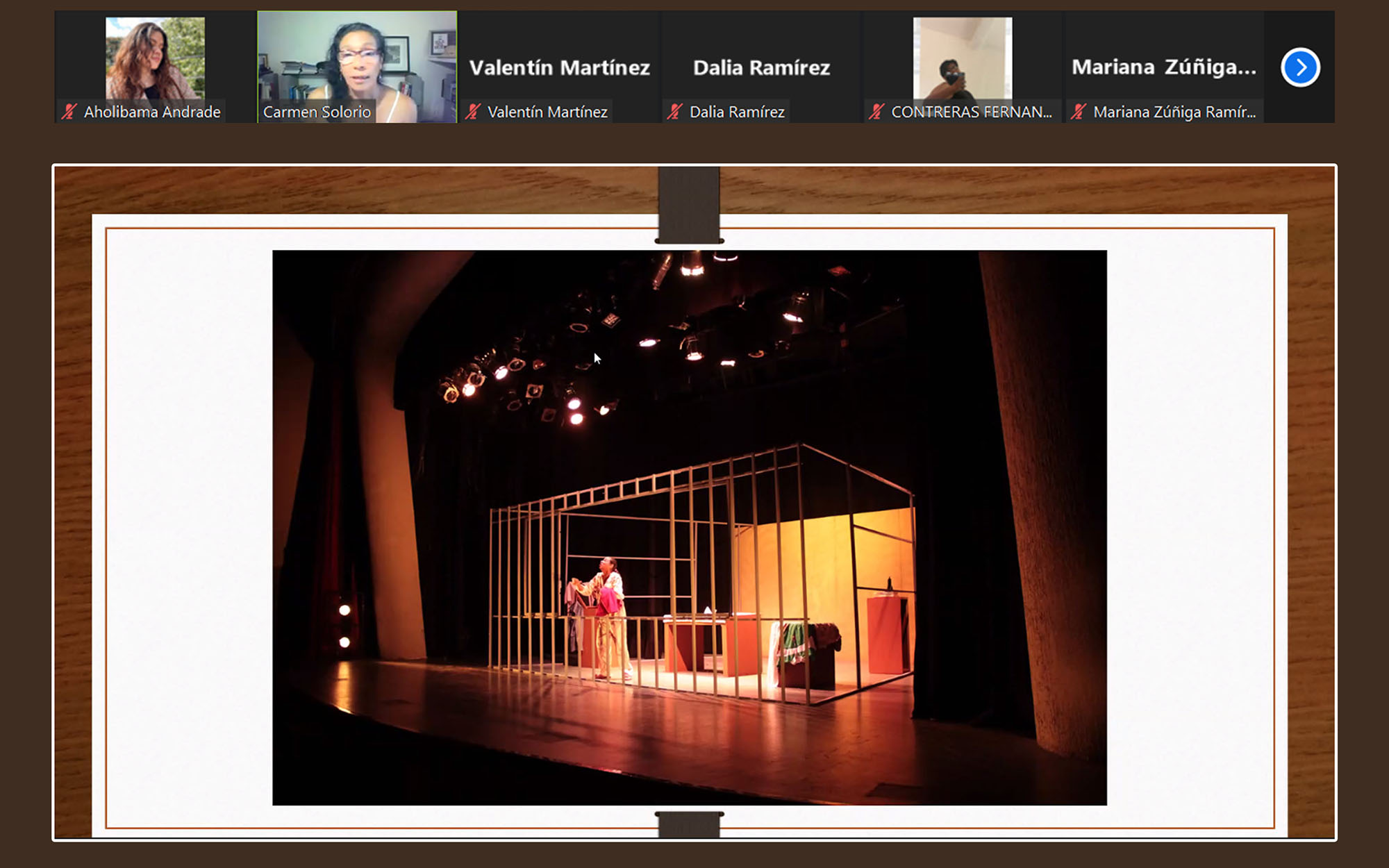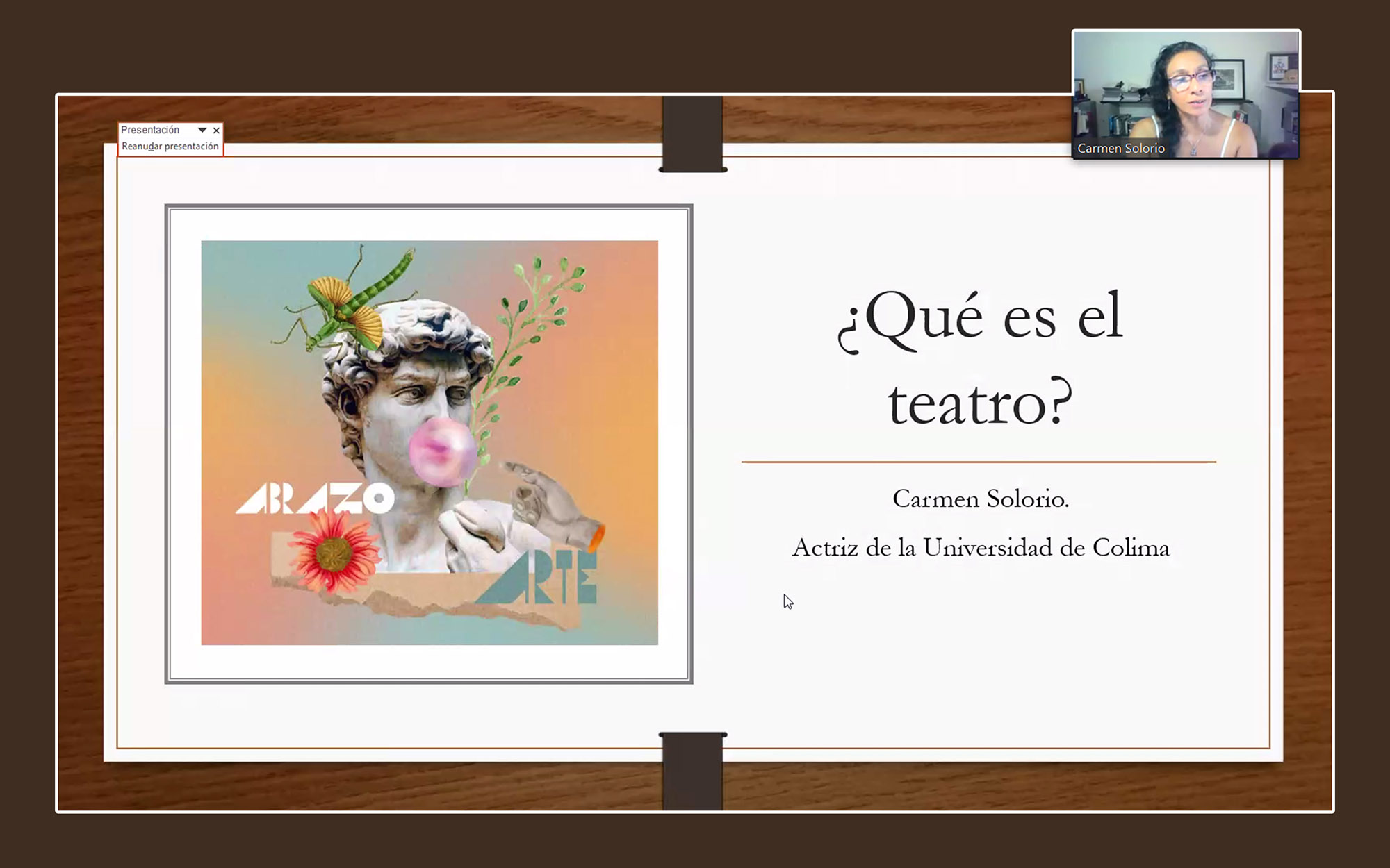 En días pasados se impartió la charla virtual “¿Qué es el teatro?”, a cargo de la actriz y dramaturga Carmen Solorio García, charla a la que se conectaron 95 personas. Dicha actividad forma parte del Programa de Apreciación Artística de la Dirección General de Difusión Cultural.