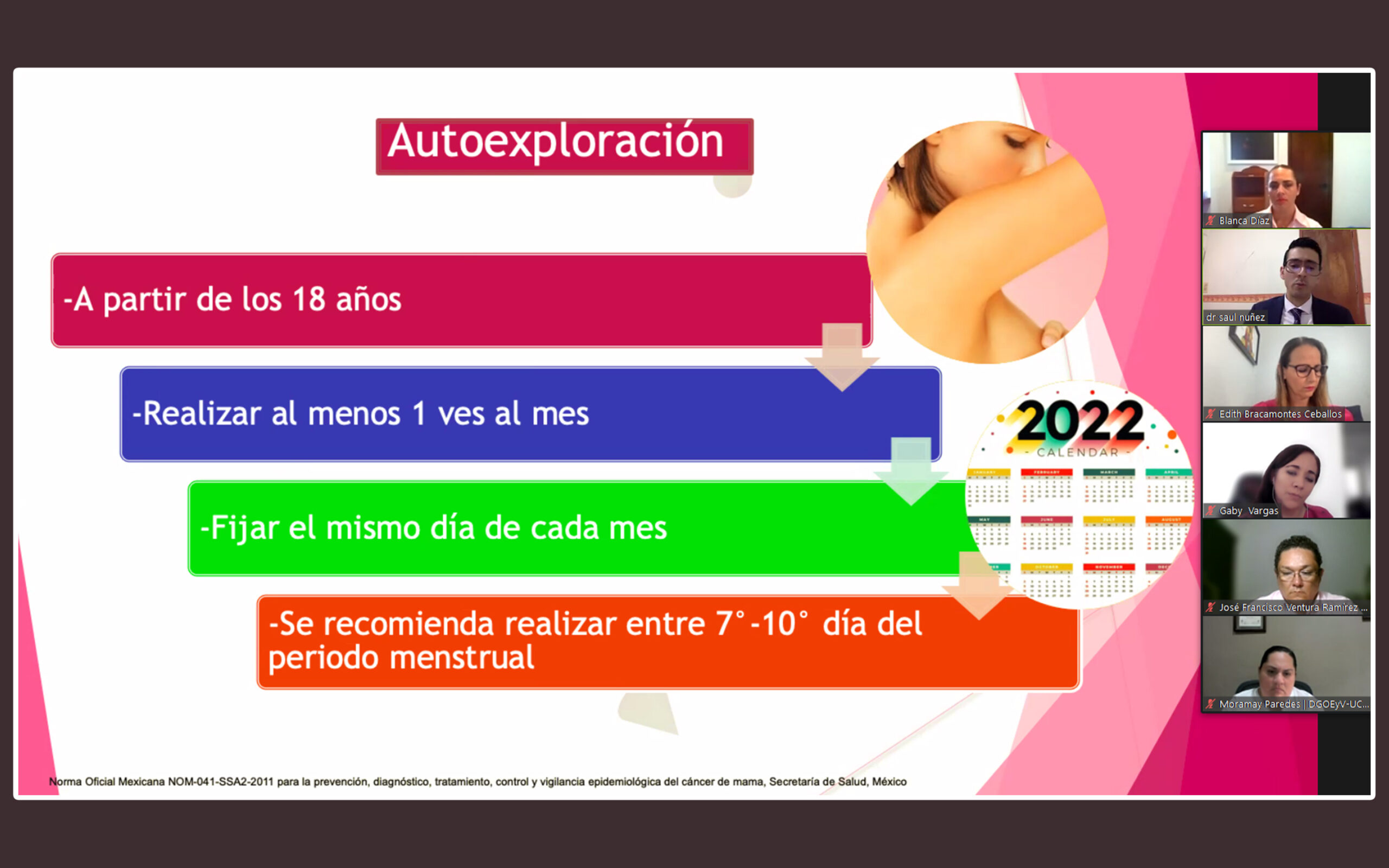 Organizada por el Voluntariado de la Universidad de Colima en el marco del Día Mundial la Lucha contra el Cáncer de Mama, en días pasados se impartió la conferencia: “Prevención y detección temprana del cáncer de mama”, a cargo del cirujano oncólogo Saúl Núñez del Toro. Esta charla se realizó a través de una plataforma virtual y contó con la participación de cerca de cincuenta personas.