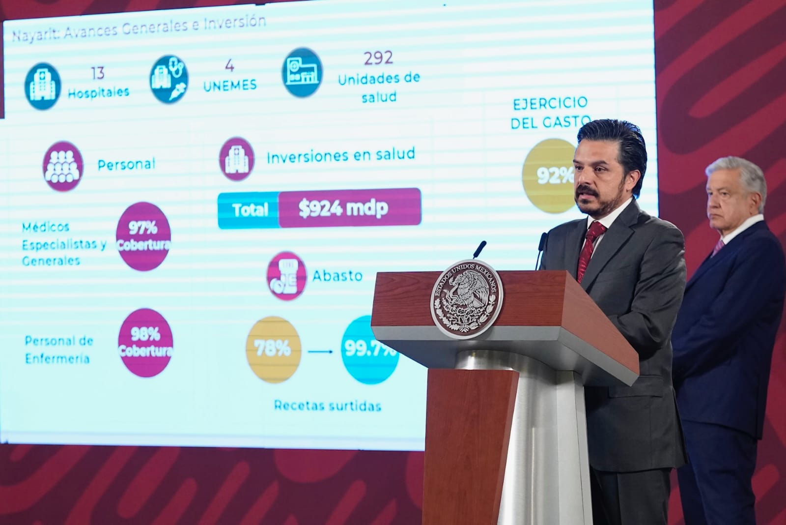 Al presentar los avances generales del Plan de Salud IMSS-Bienestar, informó que en Nayarit se cuenta con mil 79 médicos especialistas y generales, que equivale al 97 por ciento de cobertura; se han invertido 924 millones de pesos, con 92 por ciento del gasto ejercido.