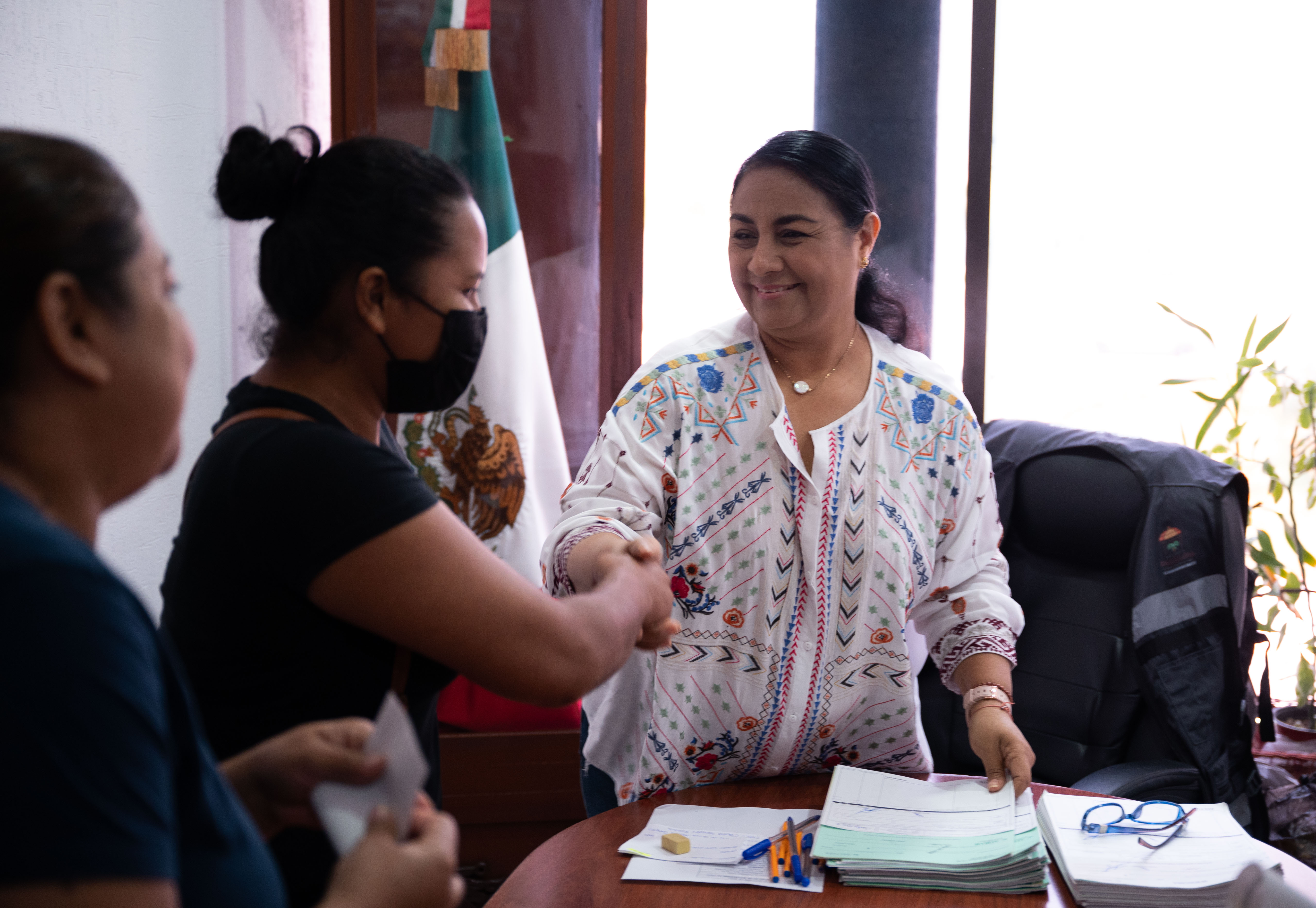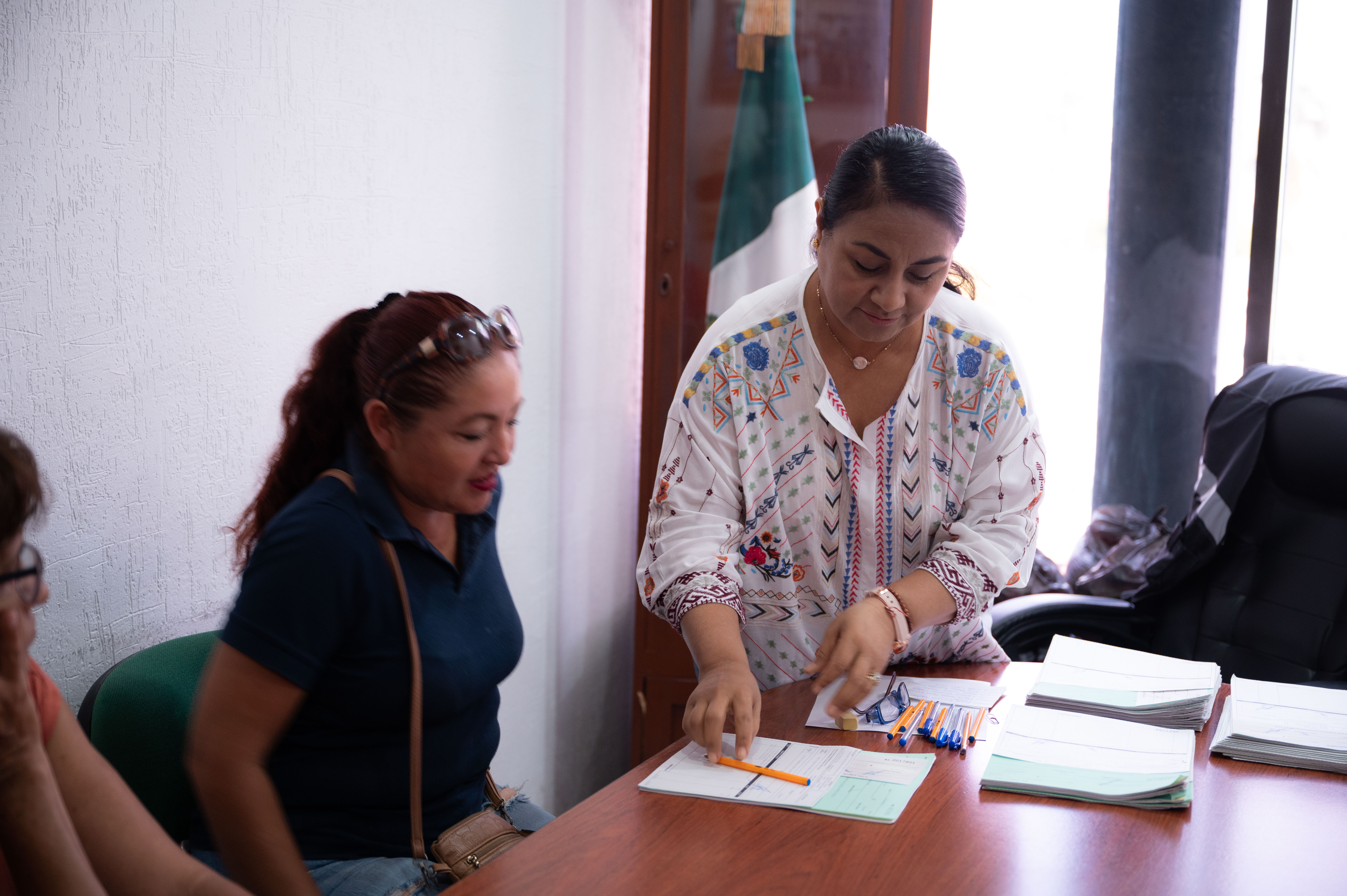 Griselda Martínez recibió a cada una de las personas que requieren de ayuda en la sala de juntas de la presidencia municipal, ahí las y los beneficiarios complementaron la documentación requerida para poder recibir el vale bancario que podrán canjear.
