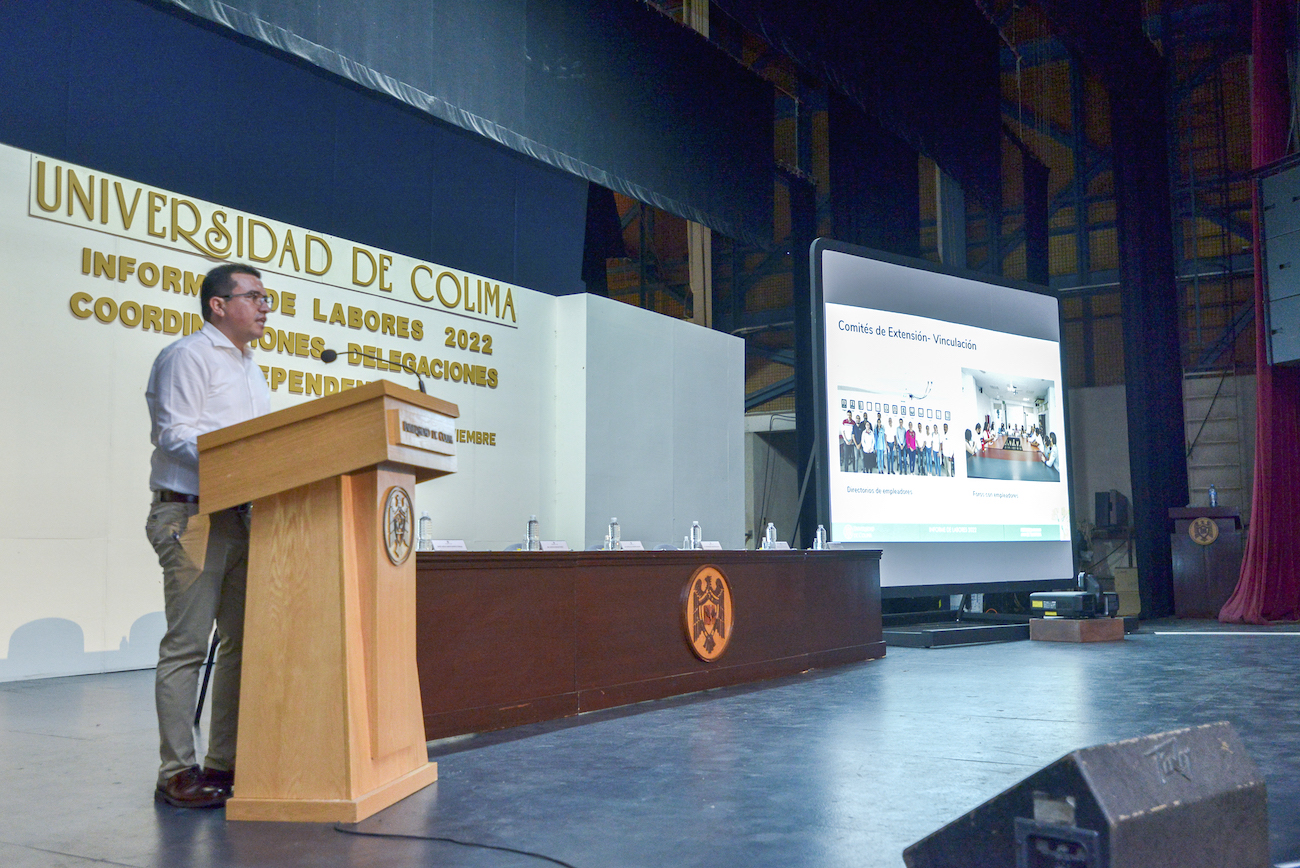 Tocó el turno de rendir su informe de labores al coordinador general de Extensión de la Universidad de Colim, Carlos Ramírez Vuelvas, quien dio un reporte detallado y puntual de sus logros en educación pertinente y de calidad, investigación para la formación y el desarrollo, extensión universitaria y gobernanza institucional.