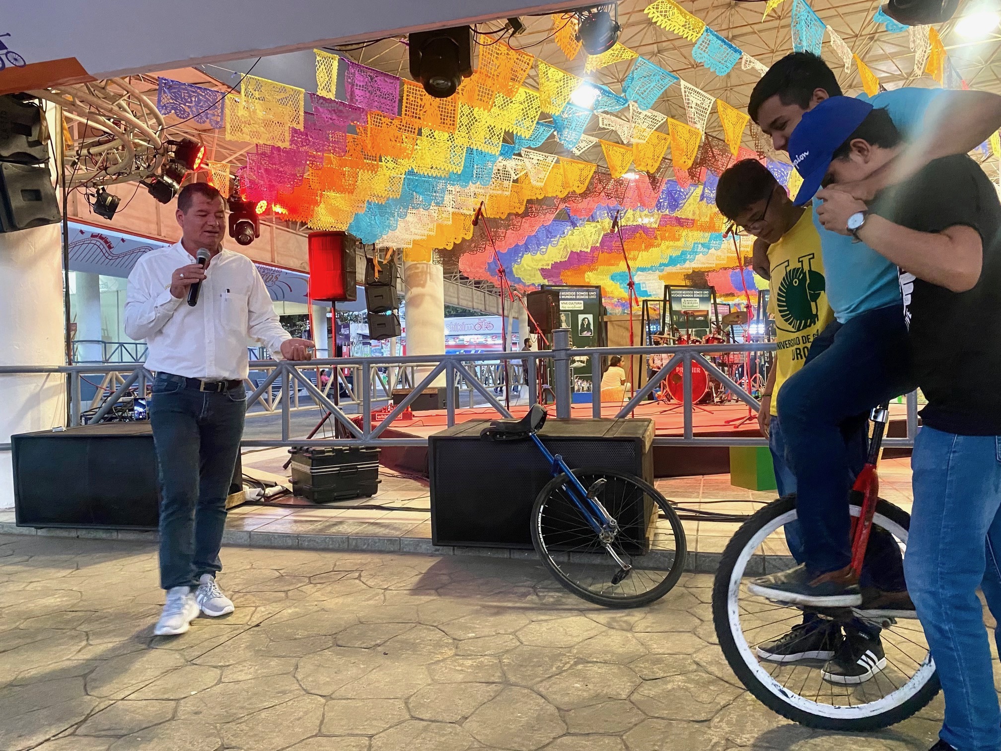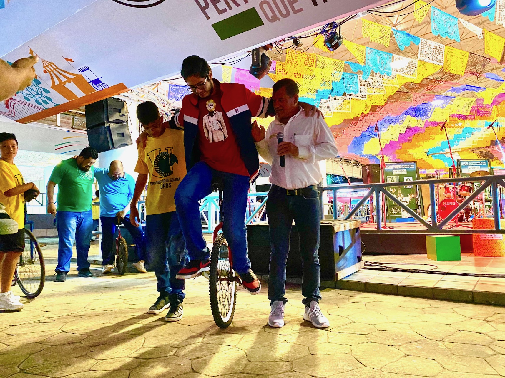 El profesor Noé Navarro Ruiz, promotor deportivo de dicha dependencia, llevó al pabellón un taller básico de uso del monociclo, una alternativa deportiva poco conocida entre los colimenses pero que, asegura el profesor, ayuda no sólo al desarrollo físico, sino a la concentración mental.