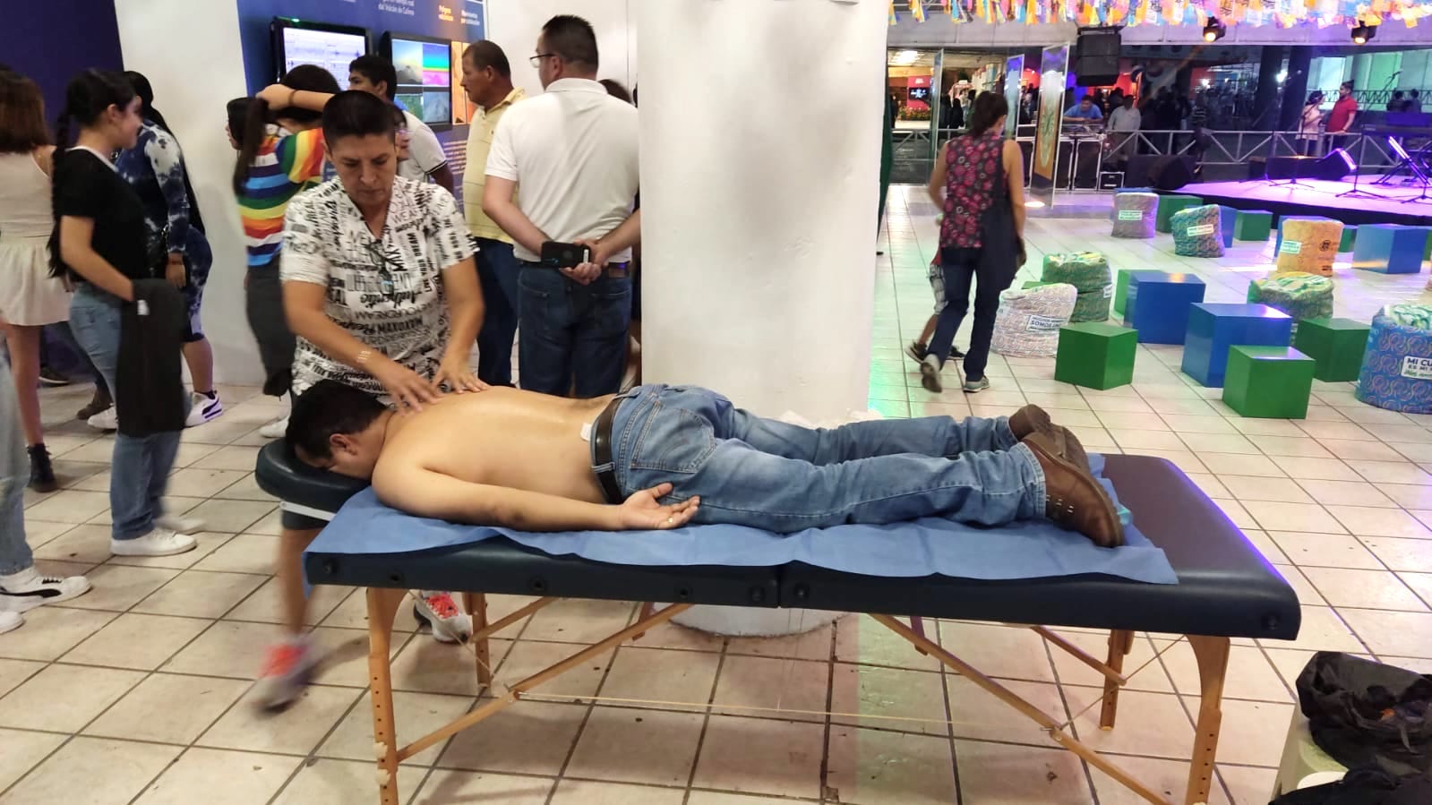 Por otra parte, de martes a viernes, después de las 4 de la tarde, la terapeuta Olivia Mercado Ruiz y el profesor Humberto Ventura Robles ofrecen masajes terapéuticos para las y los visitantes del pabellón universitario. Han llegado a atender hasta 50 personas en las 4 horas que están trabajando.