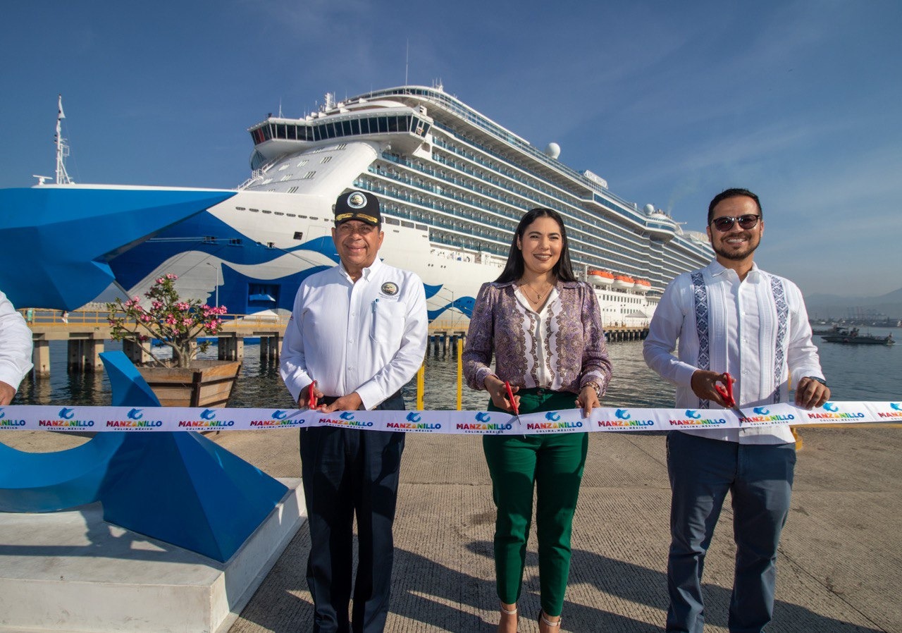 La gobernadora del estado de Colima, Indira Vizcaíno Silva, realizó el corte de listón durante la ceremonia de recepción al crucero Royal Princess -el cual es considerado como uno de los navíos más grandes del mundo en la actualidad- y que arribó la mañana de este viernes al puerto de Manzanillo.