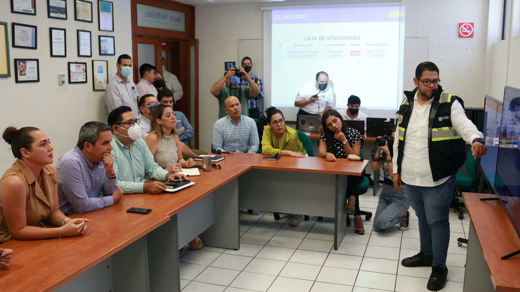 En esta ocasión estuvieron en el COE el rector Christian Jorge Torres Ortiz Zermeño; Blanca Díaz Vázquez, presidenta del Voluntariado de la UdeC; Joel Nino, secretario general; las coordinadoras generales de Docencia, Administrativa y Financiera y de Comunicación Social, Martha Magaña, Érika Ulibarri y Vianey Amezcua, respectivamente, además de Priscilia Álvarez, directora general de Recursos Humanos, la delegada y los delegados de los cinco campus; Leobardo George, abogado general; la directora general de Recursos Materiales, Luz María Urzúa; la directora del CUBI, Gaby Vargas; Luis Enrique Zamorano, secretario general del SUTUC y Marcos Buenrostro, responsable de Protección Civil Universitaria.