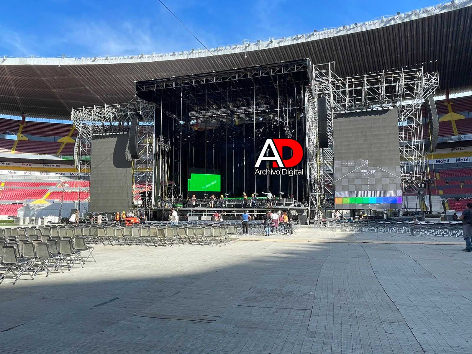 Pantallas, iluminación y sonido es parte del espectacular y majestuoso escenario centrado en el estadio Jalisco, esperando 3 mil personas en silla y 7 mil parados, después está la zona de bancas.