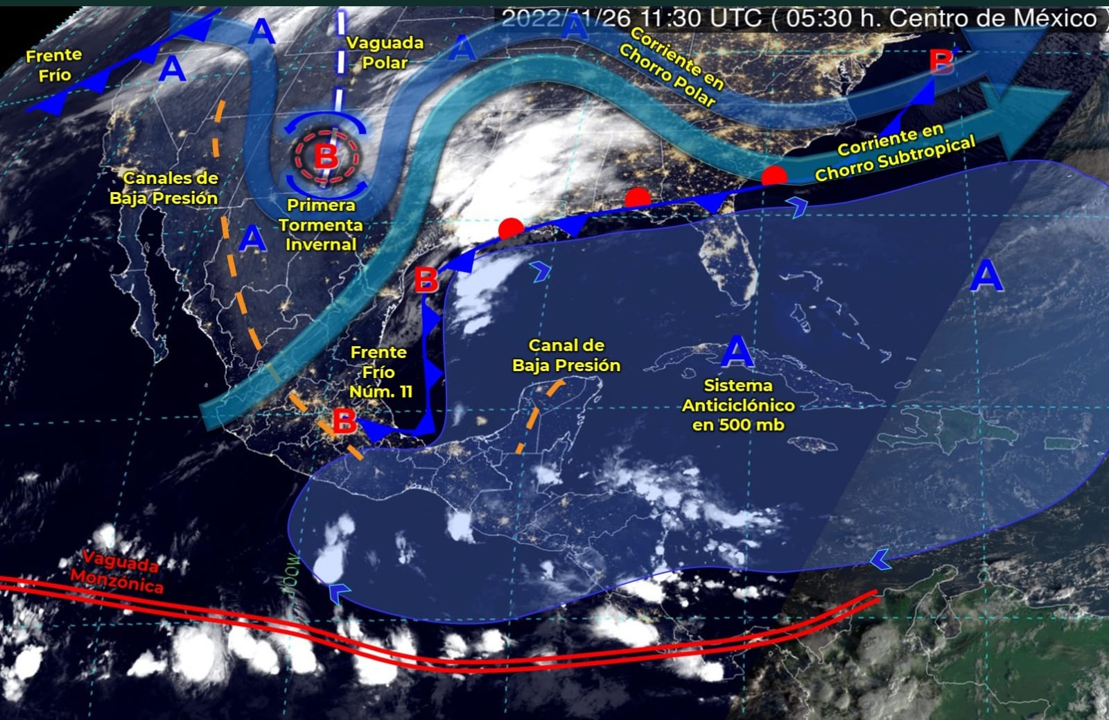 En contraparte, las temperaturas mínimas para hoy en nuestro país descenderán de -10 a -5°C con heladas en zonas montañosas de Sonora, Chihuahua, Durango, Coahuila y Zacatecas; de -5 a 0°C en Nuevo León, Tamaulipas, San Luis Potosí y Aguascalientes, y de 0 a 5°C en Baja California, Jalisco, Michoacán, Guanajuato, Estado de México, Hidalgo, Tlaxcala, Puebla y Veracruz.