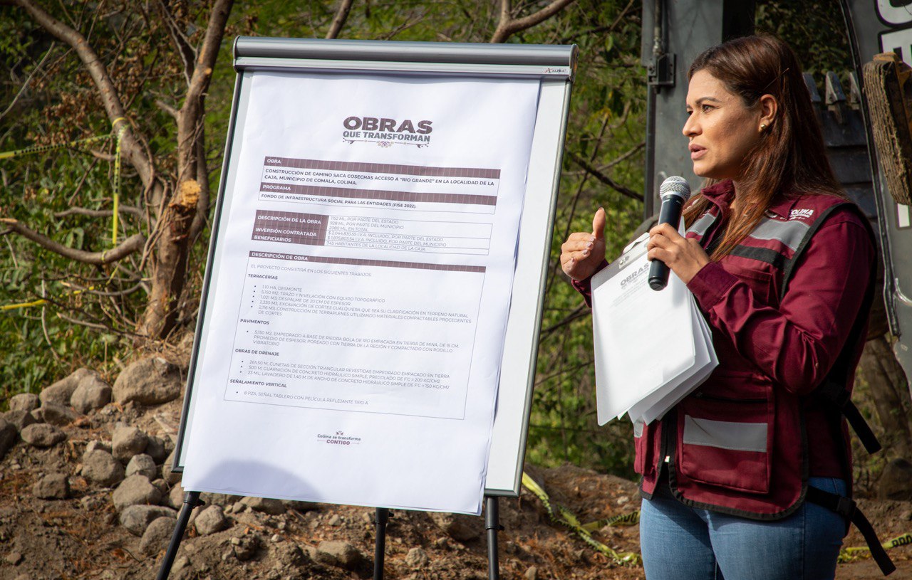 Este martes, la gobernadora del estado de Colima, Indira Vizcaíno Silva, inició una #ObraQueTransforma y que beneficia a 745 habitantes, referente al camino sacacosechas La Caja – Río Grande, en Comala, a través del Fondo de Infraestructura Social para las Entidades (FISE), con inversión de un millón 995 mil 563 pesos, por parte del Gobierno del Estado y un millón 185 mil pesos por el ayuntamiento comalteco.