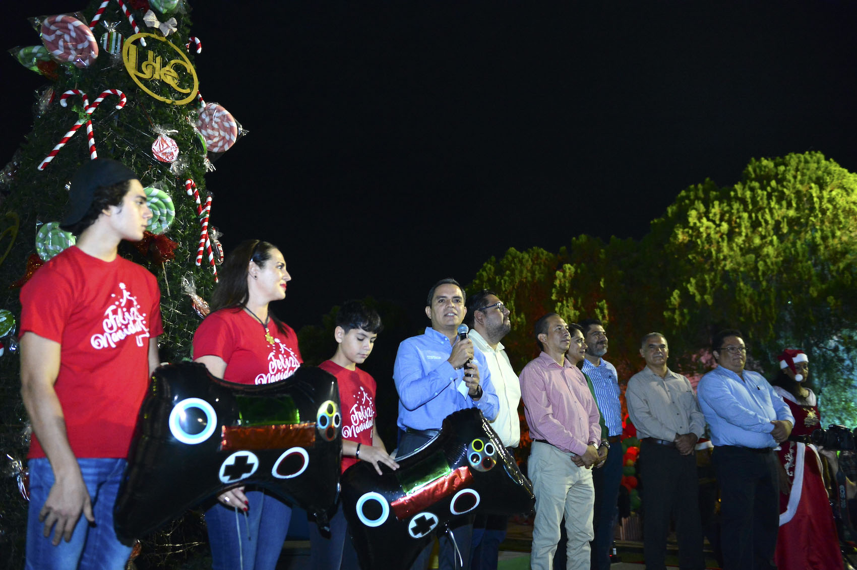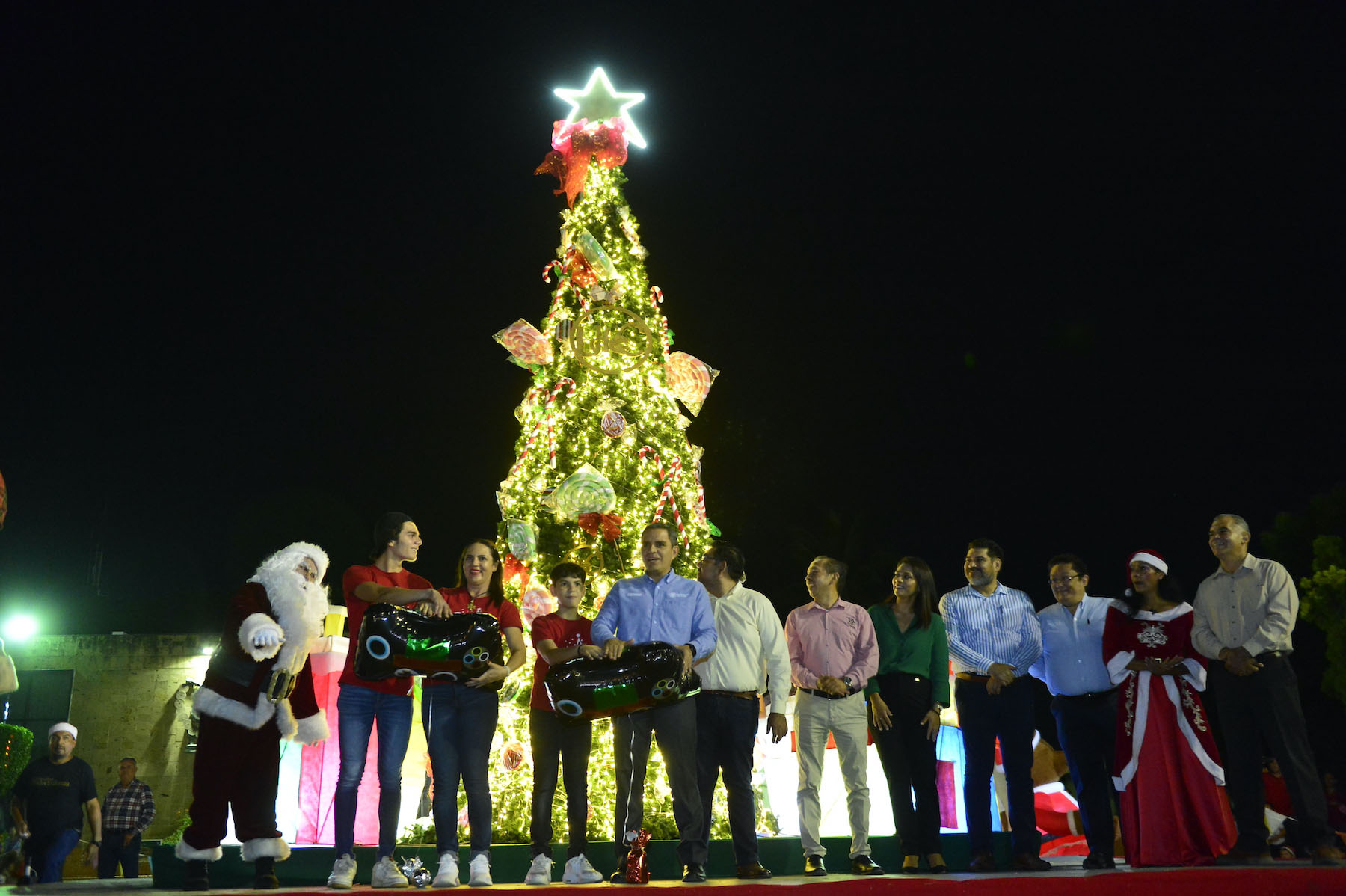 A las 7 en punto, el rector Christian Jorge Torres Ortiz Zermeño, acompañado por su esposa Blanca Liliana Díaz Vázquez, presidenta del Voluntariado de la UdeC y sus dos hijos, encendió el árbol navideño instalado frente al edificio de rectoría.