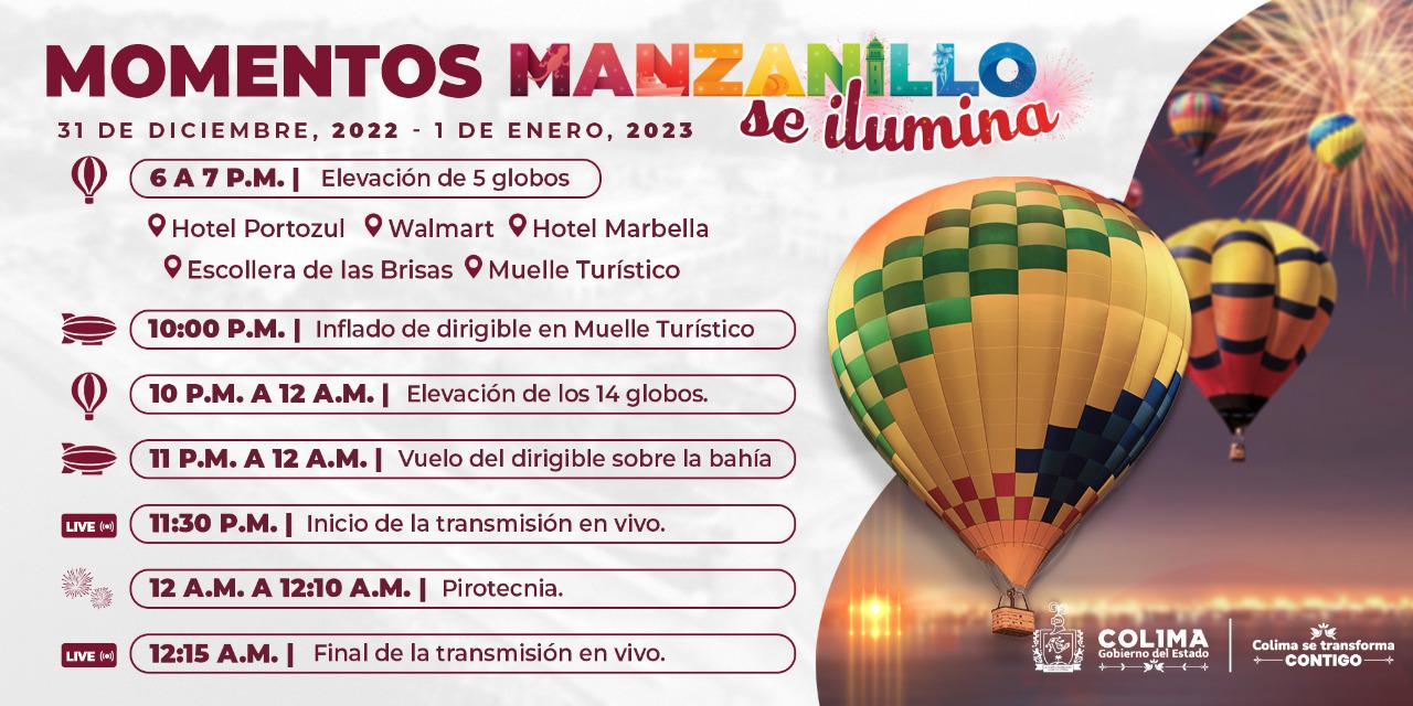 A las diez de la noche, se realizará el inflado de un gran dirigible en el muelle turístico; de las 10 a las 12 de la noche se efectuará la elevación de los catorce globos aerostáticos; de 11 a 12 de la noche se podrá apreciar el vuelo del dirigible por toda la Bahía de Manzanillo, mientras que a las 11:30 pm iniciará la transmisión en vivo; y de las 12 a las 12:10 de la noche se podrá apreciar la fiesta de luces con la pirotecnia, para dar la bienvenida al año nuevo 2023. La transmisión en vivo a través de las redes concluirá a las 12:15 de la noche.