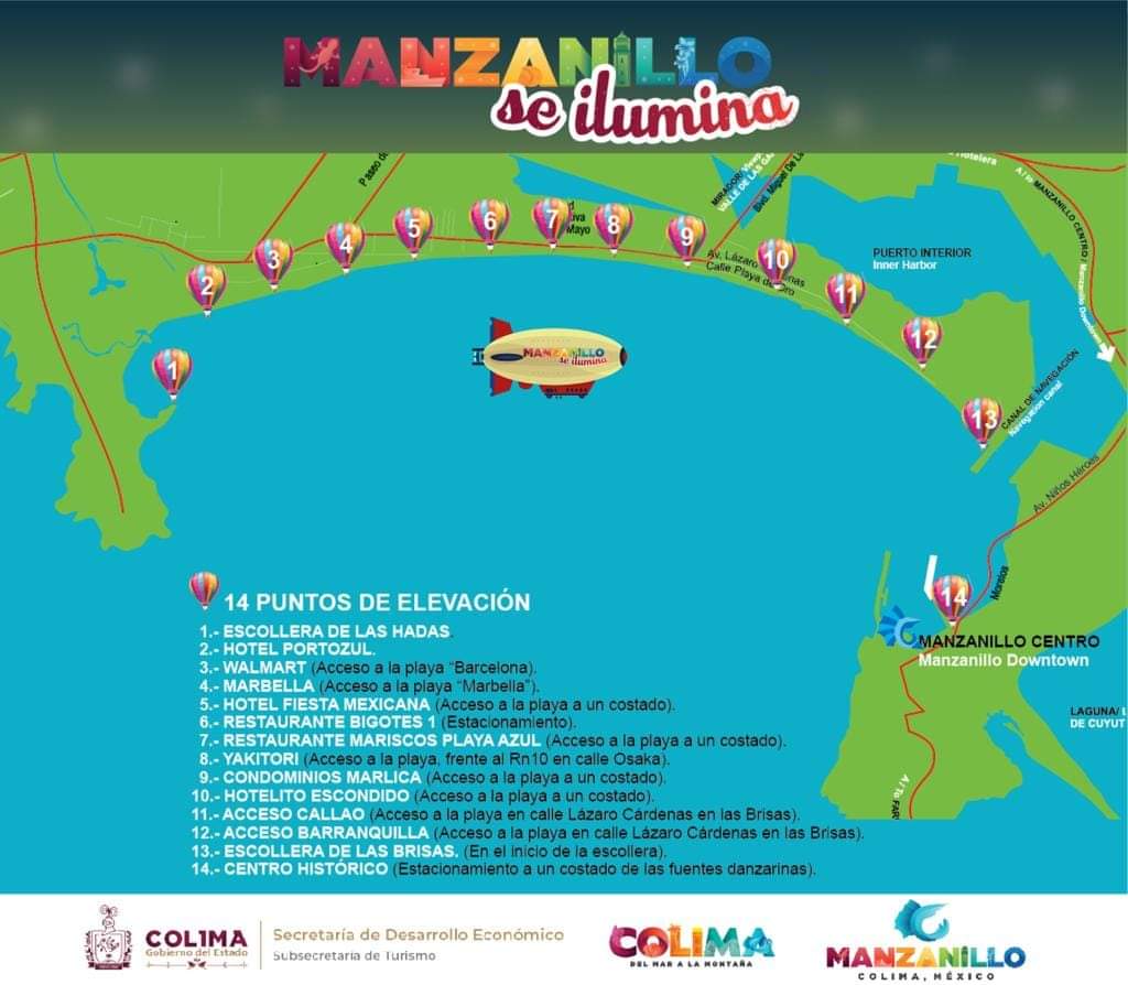 El Gobierno del Estado de Colima, a través de la Subsecretaría de Turismo, invita a la población colimense y miles de turistas que ya se encuentran en la entidad, a despedir el año 2022 hoy sábado 31 de diciembre asistiendo al tradicional espectáculo “Manzanillo se Ilumina”, al que esta ocasión se incorporan catorce globos aerostáticos, con la elevación de los primeros cinco globos a partir de las seis de la tarde, desde los siguientes puntos: Hotel Portoazul, Walmart, Hotel Marbella, escollera de Las Brisas y en el muelle turístico de Manzanillo, para surcar el cielo en la bahía.