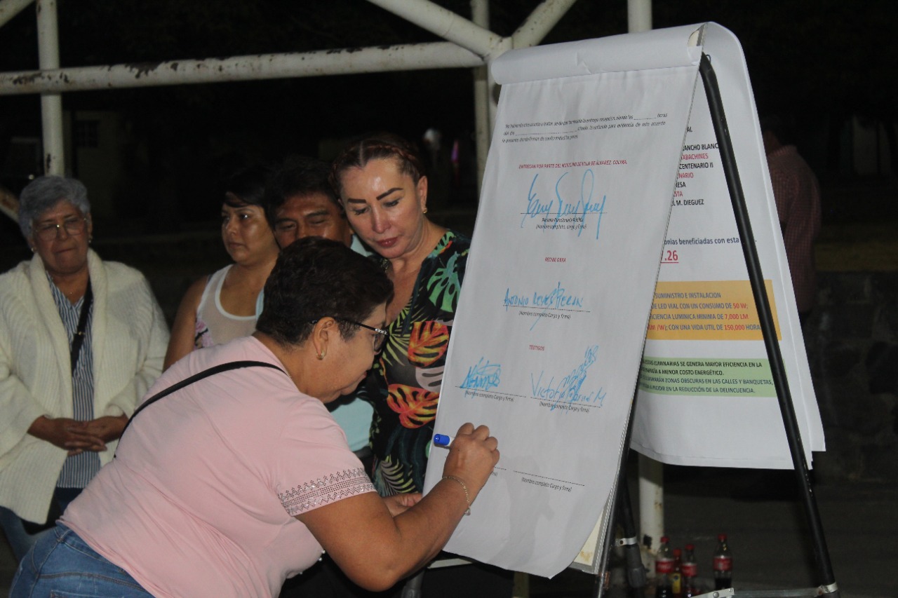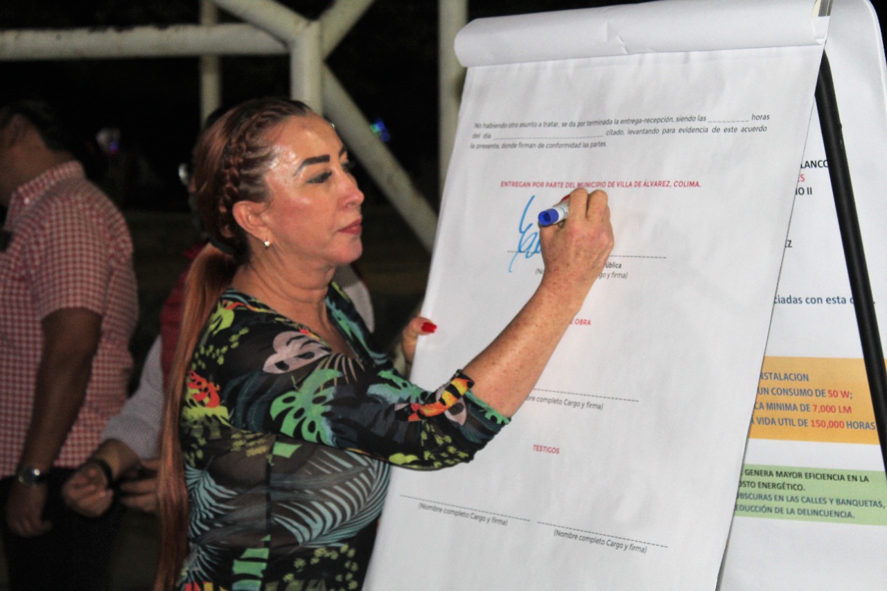 Tey Gutiérrez, Presidenta Municipal de Villa de Álvarez, entregó la obra de rehabilitación de la red de alumbrado público de la colonia Villas San José, donde fueron instaladas 63 luminarias led de última generación en beneficio de la más de 2 mil 300 personas que viven en este asentamiento.