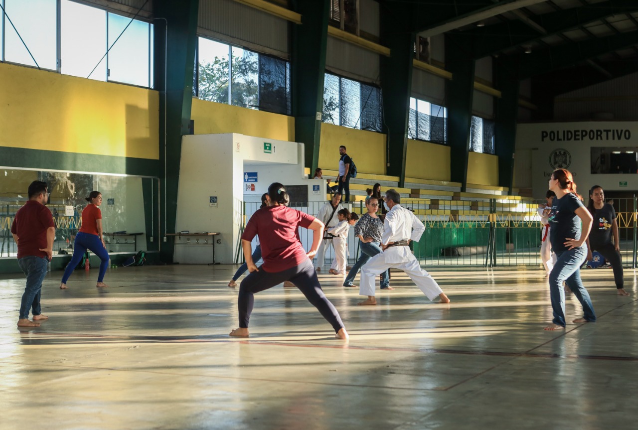 Esta clase se imparte los días 9, 11, 13, 16 y 18 de enero, en un horario de 17:00 a 18:00 horas, junto al área del gimnasio del Polideportivo, con la finalidad de que las y los docentes aprendan las nociones básicas de la defensa personal y mejoren su condición física.