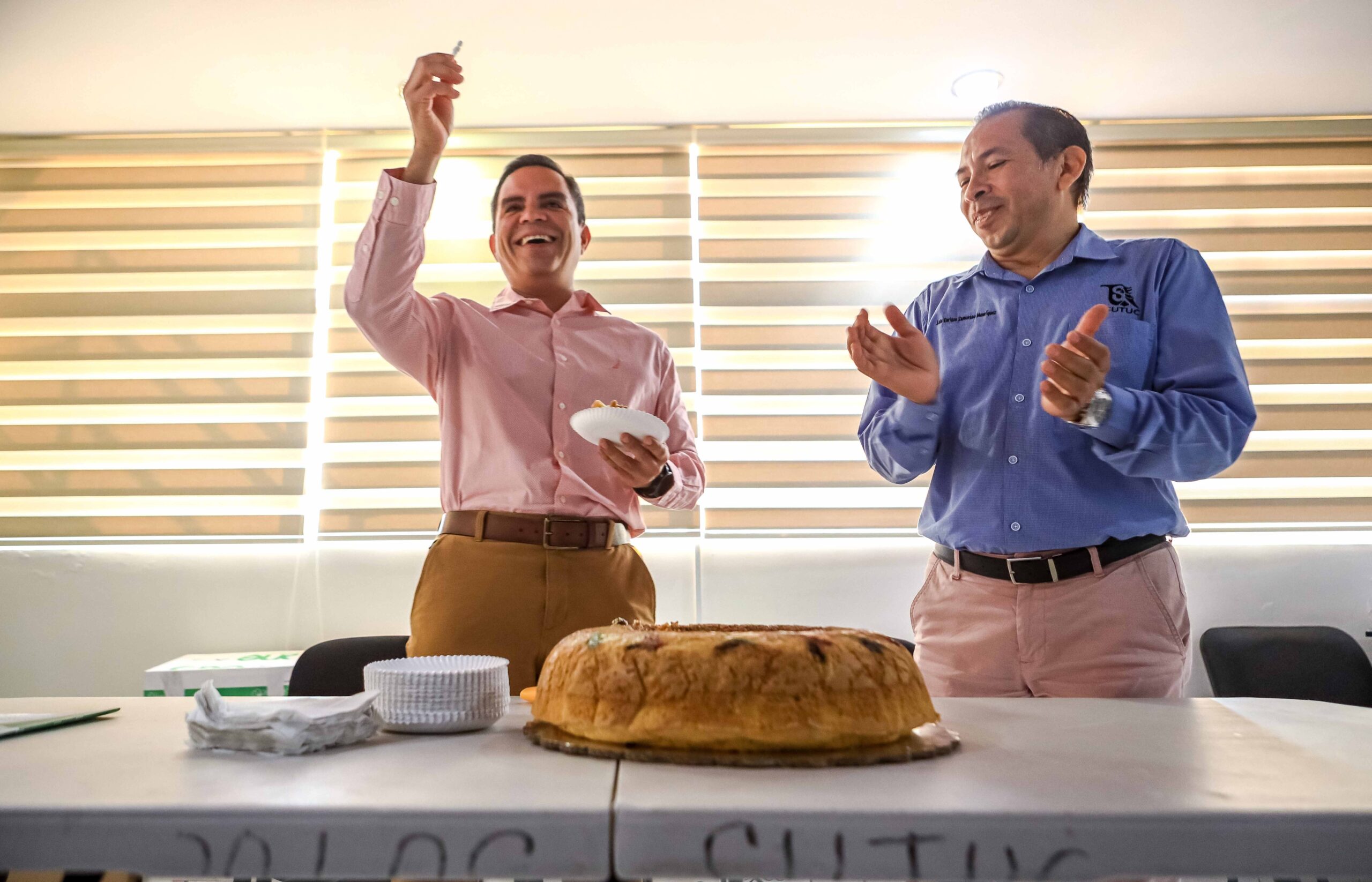 *Integrantes del comité ejecutivo central del SUTUC parten la rosca de reyes con el rector Christian Torres Ortiz.