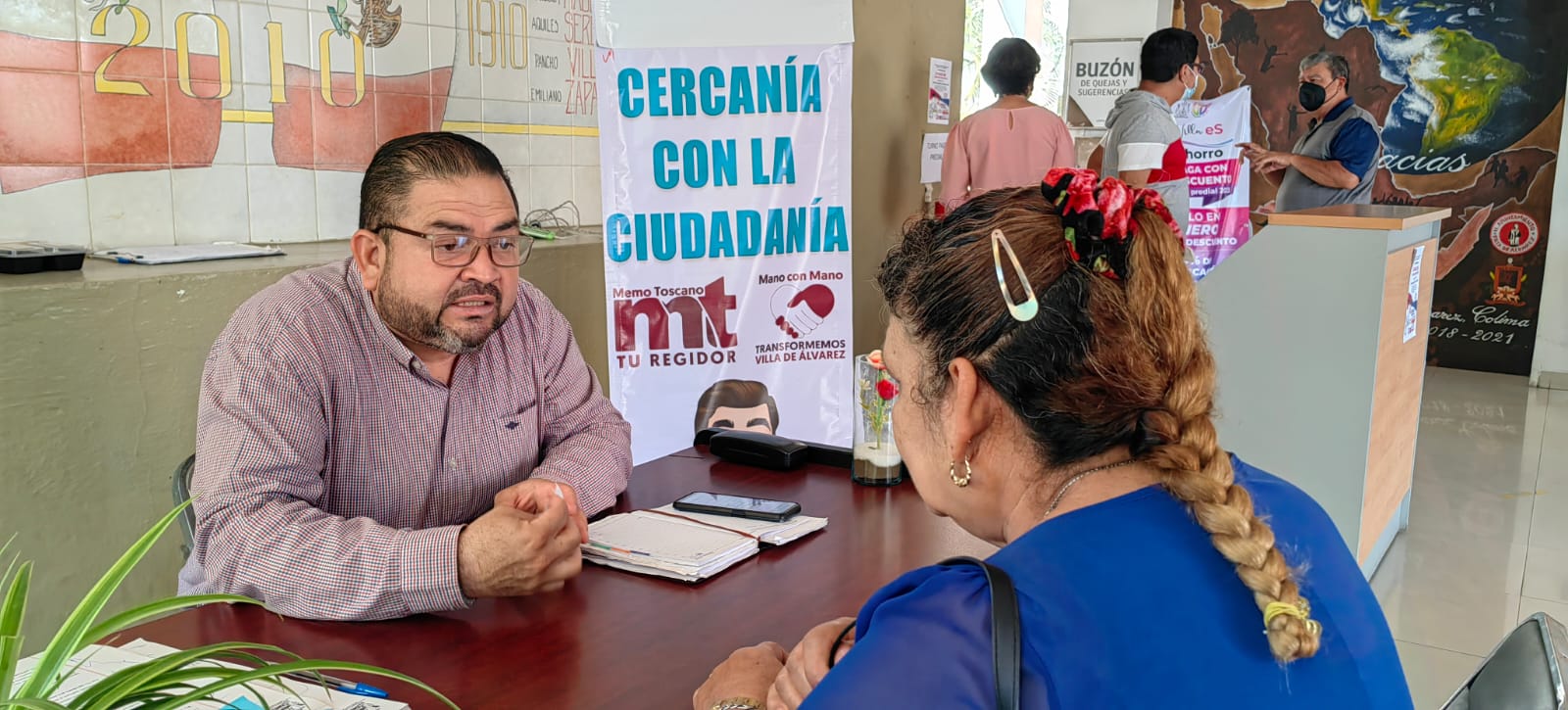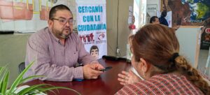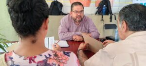 En la entrada principal del ayuntamiento municipal de Villa de Álvarez, el regidor Memo Toscano atiende las gestiones de las y los villalvarenses que acuden en busca de apoyo.