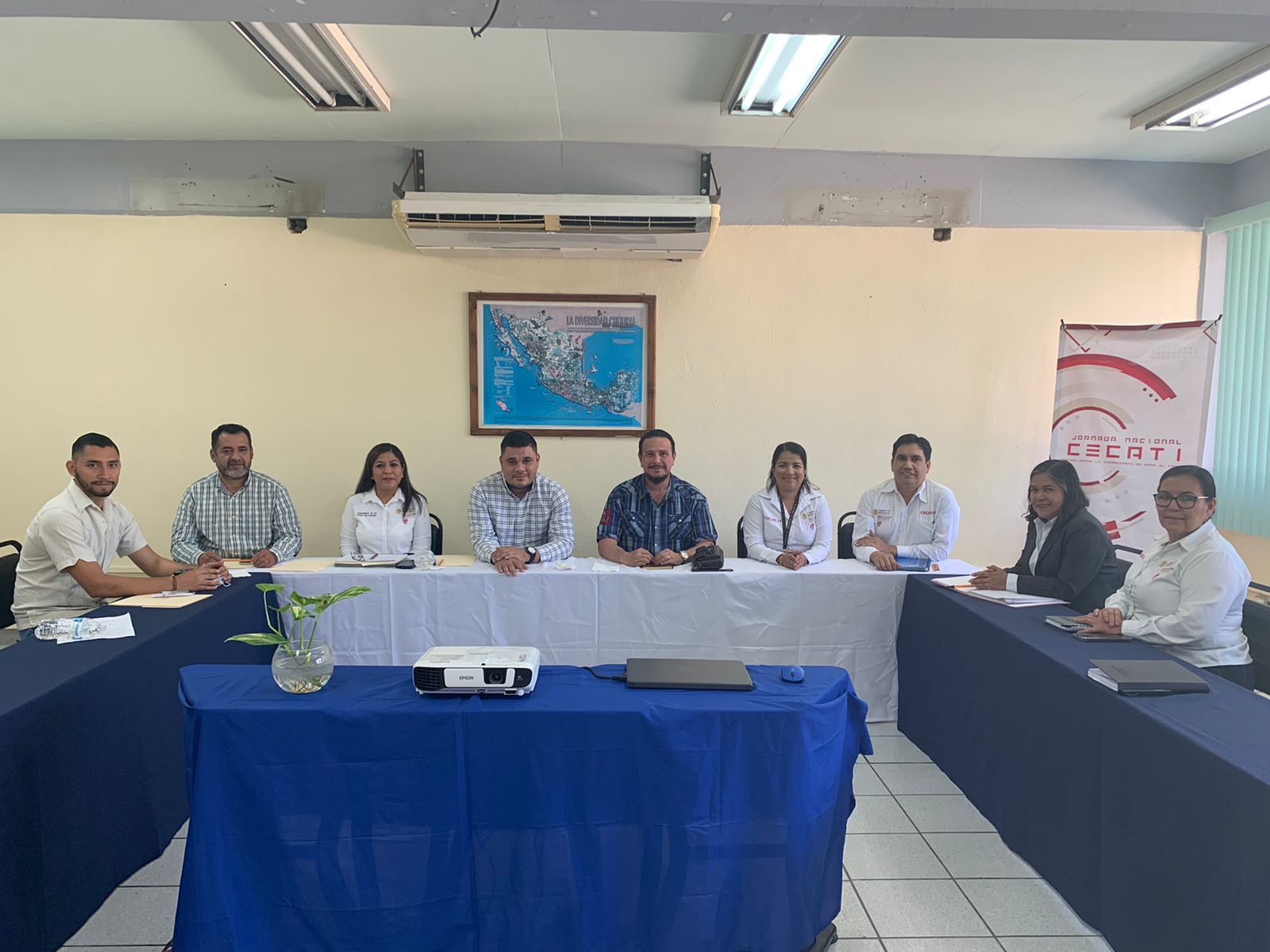 En la reunión estuvieron: Enedelia Rosas Preciado, jefa de vinculación; Elizabeth Arroyo Menda, jefa de capacitación; Daniel Sánchez Covarrubias, jefe de servicios administrativos; personal de la Dirección General de Centros de Formación para el Trabajo, responsable del área técnica, Josefina Arroyo Mérida, asistente Estatal, Sergio Armando Flores Cabrera; y el enlace educativo, Héctor Hugo Contreras Vásquez.