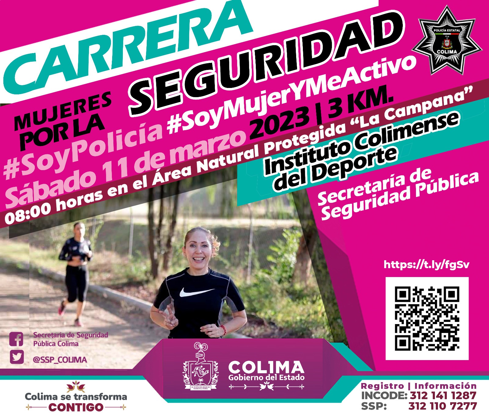 El Gobierno del Estado de Colima, a través de la Secretaría de Seguridad Pública (SSP), en coordinación con la Unidad para Igualdad de Género y el Instituto Colimense del Deporte (Incode), anunció en rueda de prensa la tercera edición de la carrera pedestre Mujeres por la Seguridad #SoyPolicía y #SoyMujerYMeActivo, a realizarse por el Día Internacional de las Mujeres, en el área natural protegida La Campana, el sábado 11 de marzo a partir de las 8:00 horas, con una distancia de tres kilómetros.