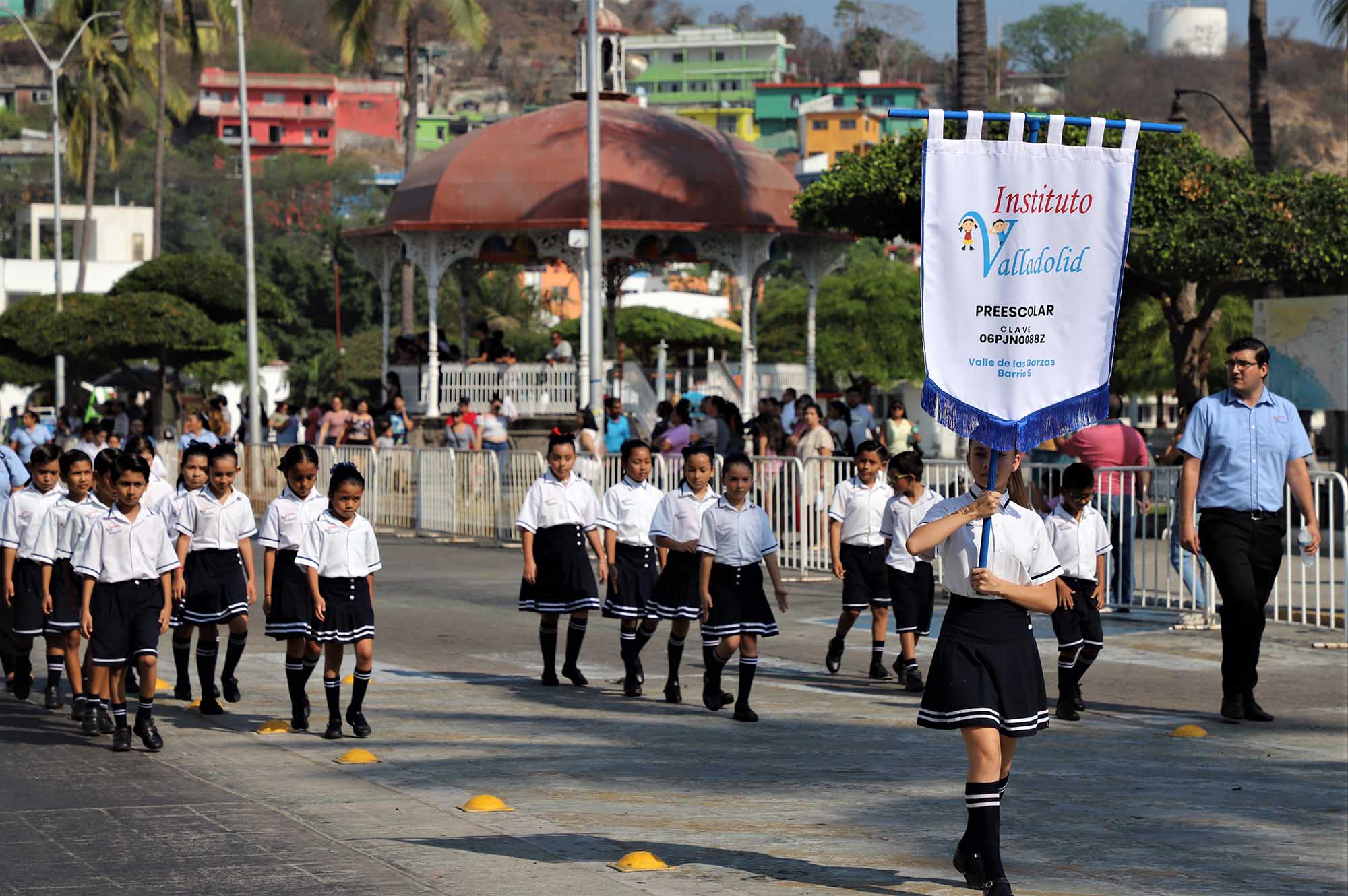 Uno a uno, los contingentes, integrados por estudiantes desde el nivel primaria hasta el Superior, marcharon con sus respectivas escoltas al unísono de la banda de guerra de la dirección general de Seguridad Pública y Policía Vial.