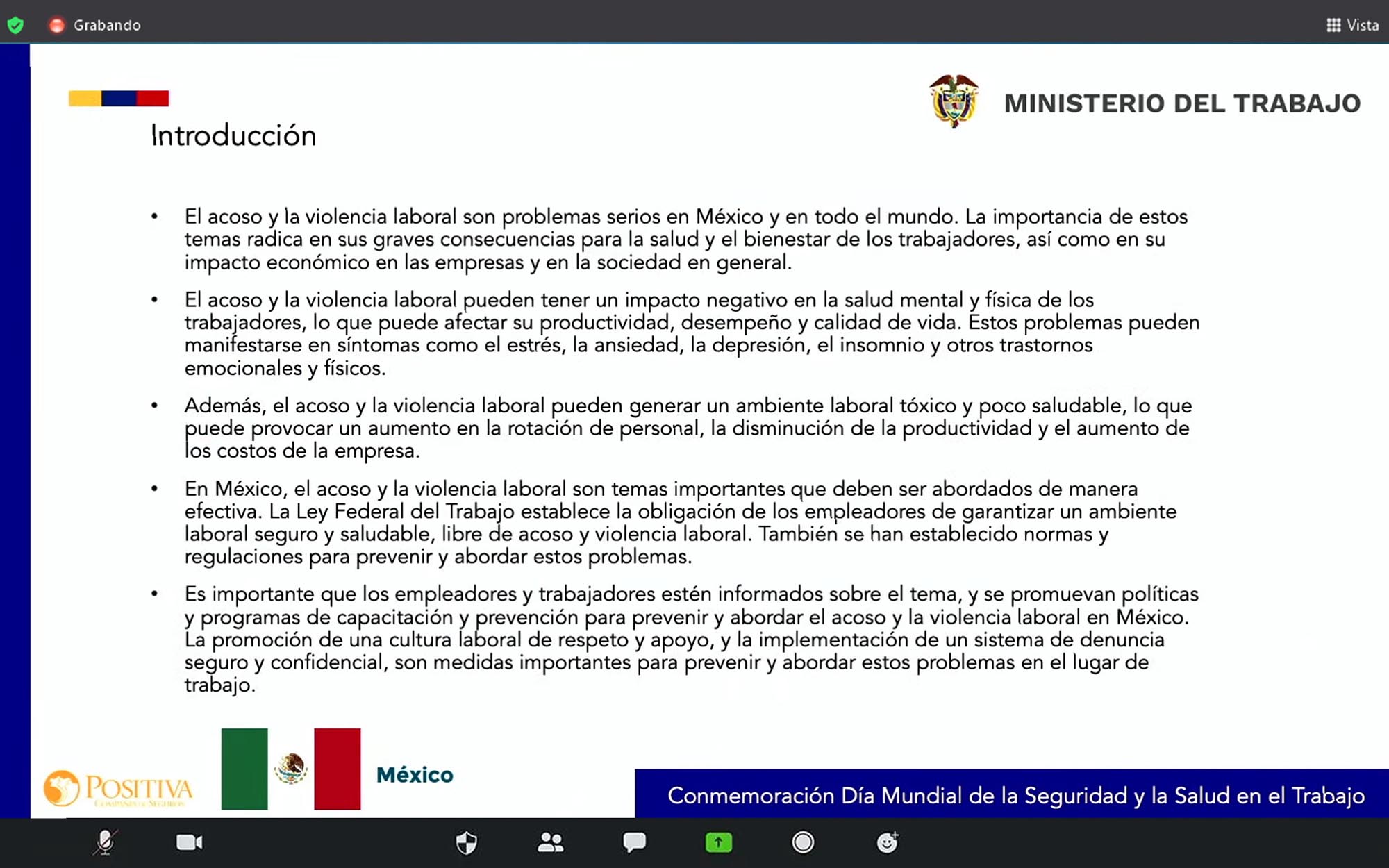 En su charla, Calderón Mafud explicó el marco legal mexicano para el acoso laboral y la erradicación de la violencia, el impacto negativo en la salud física y mental de las personas, así como el clima laboral y de seguridad de los equipos de trabajo.