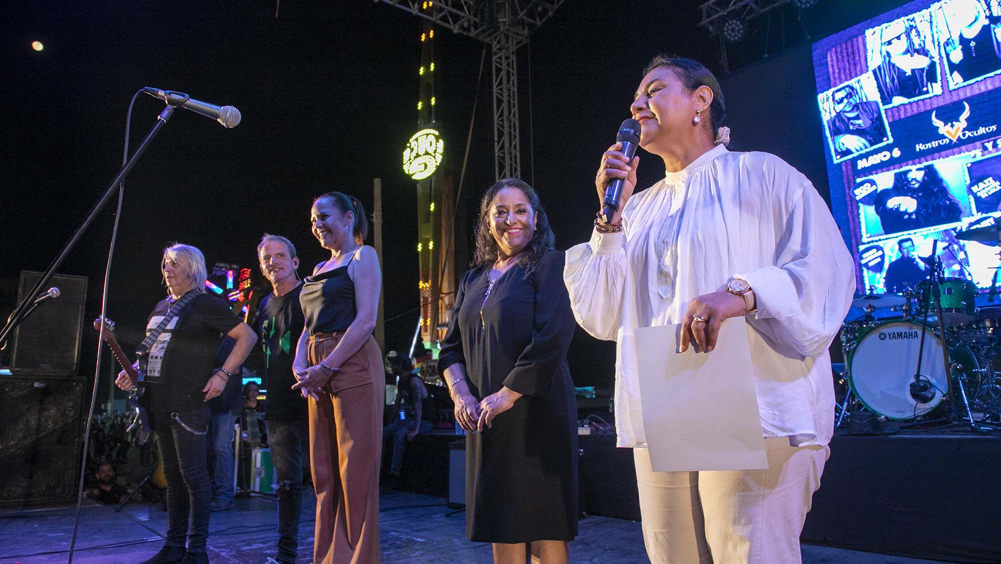 La Presidenta Municipal Griselda Martínez subió al escenario acompañada de Hermelinda Anguiano, Directora de Ferias Eventos y Exposiciones, y de la secretaria del H. Ayuntamiento de Manzanillo, para hacer entrega de un merecido reconocimiento a todos los músicos y cantantes que se presentaron en el marco de las Fiestas de Mayo. La alcaldesa señaló que a través del H. Ayuntamiento de Manzanillo se pueden organizar de eventos gratuitos de gran calidad porque la gente merece ser feliz y porque el público sí se sabe comportar.