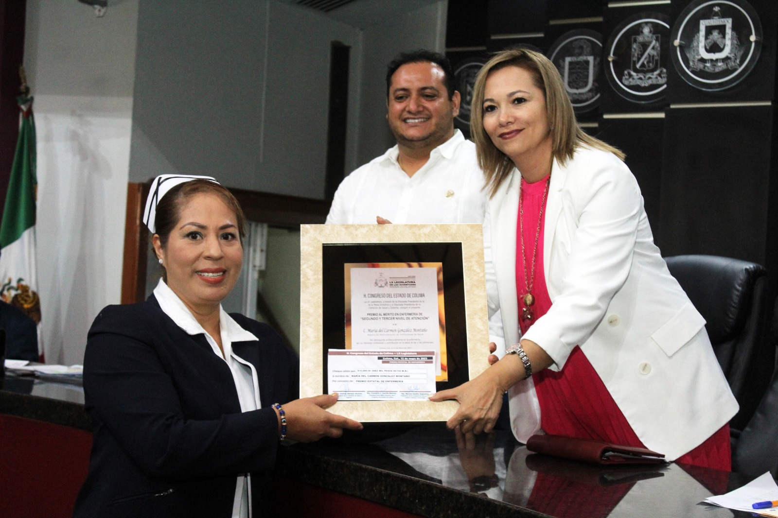 En este acto solemne entregó el Premio Estatal de Enfermería 2023 a María del Carmen González Montaño en la categoría de Segundo y Tercer Nivel de Atención; a Blanca Alejandrina Ramos Ávalos en la categoría de Primer Nivel de Atención, y a Nadia Yaneth Cortés Álvarez en la categoría de Gestión e Investigación en Enfermería.