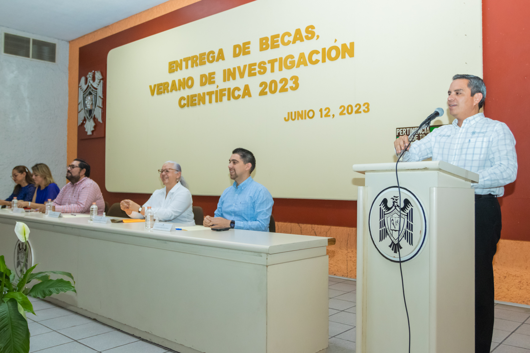 Para impulsar la formación de capital intelectual de alto nivel académico que en el futuro inmediato contribuya al desarrollo regional, nacional e internacional, este lunes, en el auditorio de la Biblioteca de Ciencias, el rector Christian Jorge Torres Ortiz Zermeño entregó 83 becas a las y los estudiantes que resultaron elegidos para hacer movilidad en el XXVIII Verano de la Investigación Científica y Tecnológica del Programa Delfín 2023.