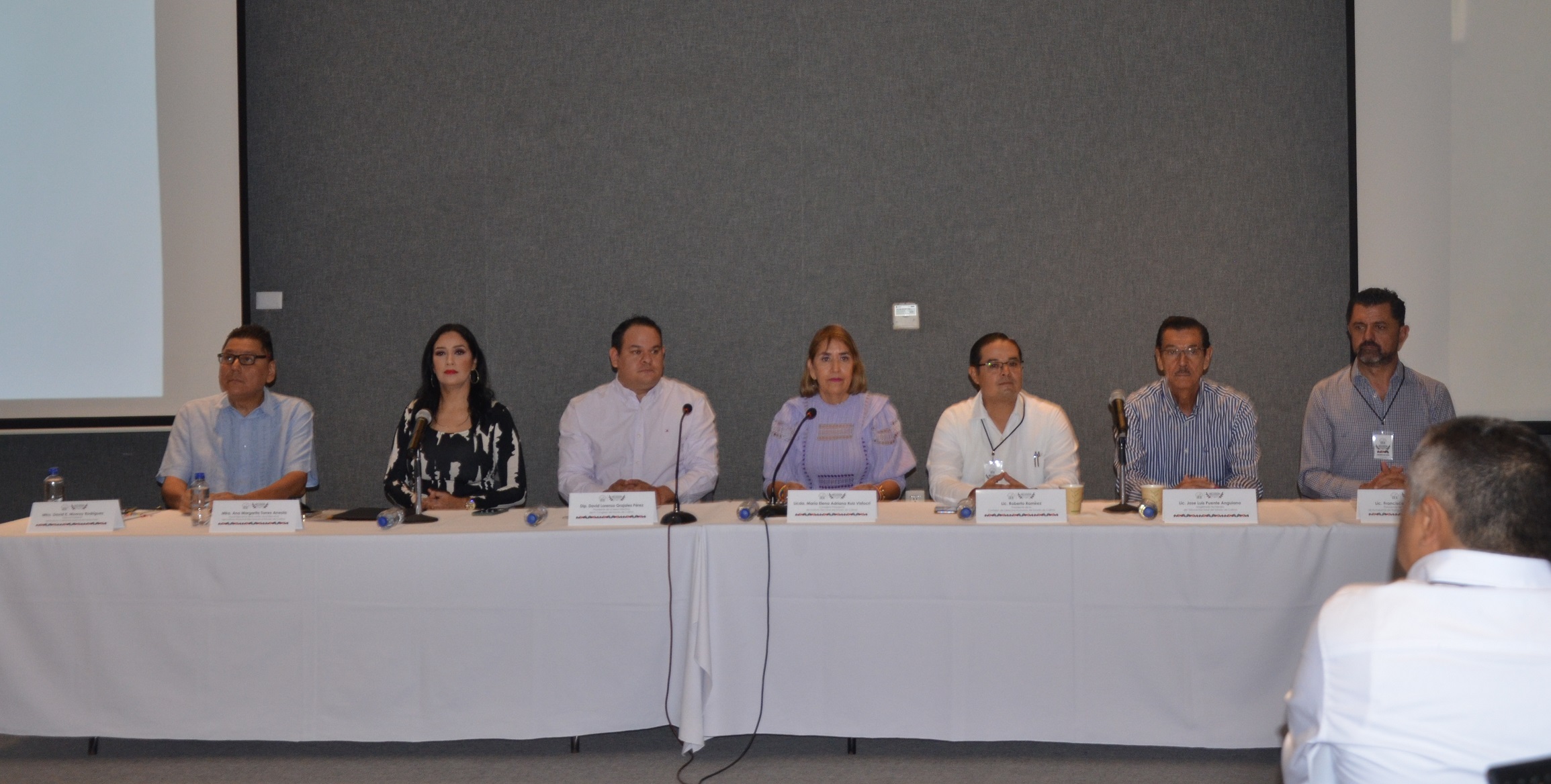 En la mesa del presídium estuvieron el diputado David Lorenzo Grajales Pérez, Presidente de la Mesa Directiva del H. Congreso del Estado de Colima; María Elena Adriana Ruiz Visfocri, Presidenta del Instituto Electoral del Estado de Colima (IEE); Ana Margarita Torres Arreola, Vocal Ejecutiva Local del Instituto Nacional Electoral (INE); José Luis Puente Anguiano, Magistrado del Tribunal Electoral del Estado (TEE); Roberto Ramírez, Presidente de la Comisión de Derechos Humanos del Estado de Colima (CDHEC); David E. Monroy Rodríguez, Director General del Instituto Colimense para la Discapacidad (Incodis); y Francisco Medina Solana, Presidente de la Cámara Nacional de la Industria de Restaurantes y Alimentos Condimentados (Canirac).