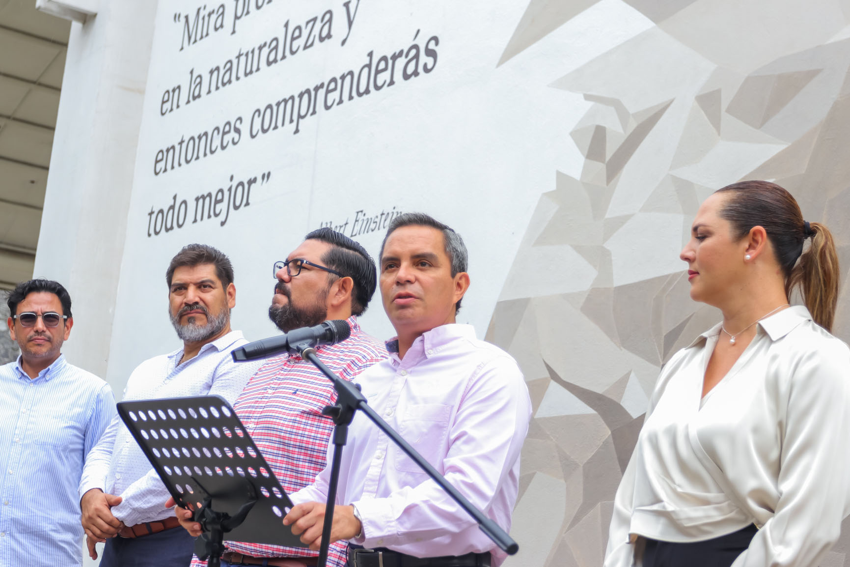 La frase que acompaña al mural, continuó, “Mira profundamente en la naturaleza y entonces comprenderás todo mejor”, de Albert Einstein, “invita a observar el universo material con los fenómenos del mundo físico sin la intervención humana, pero que nos incluye”.