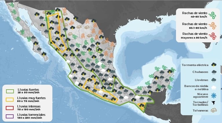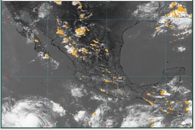 Para el Pacífico Centro, el SMN estima cielo medio nublado a nublado con lluvias puntuales muy fuertes en Nayarit y Michoacán, así como lluvias puntuales fuertes en Colima y Jalisco; todas con descargas eléctricas y posible caída de granizo; las cuales podrían incrementar los niveles de ríos y arroyos, y generar deslaves e inundaciones.