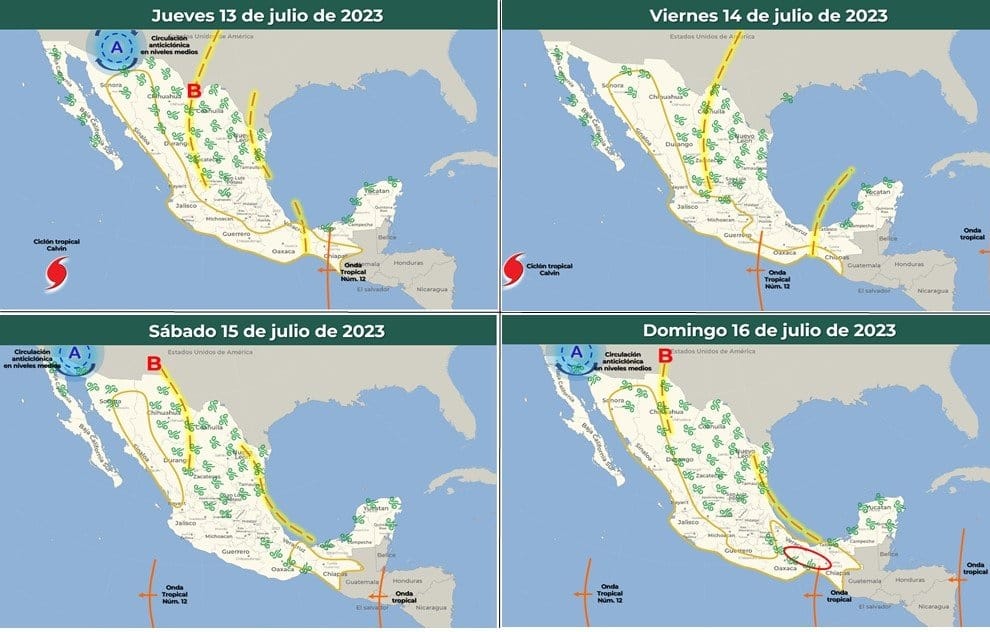 Respecto a las temperaturas máximas, el organismo de la Comisión Nacional del Agua (Conagua) estima que Colima podría alcanzar los 40 grados Celsius, al igual que Jalisco, Michoacán, Guerrero, Oaxaca, Baja California Sur, Sinaloa, Nayarit, Chiapas, Durango, San Luis Potosí, Veracruz, Tabasco y Quintana Roo.