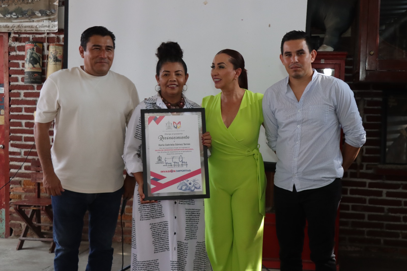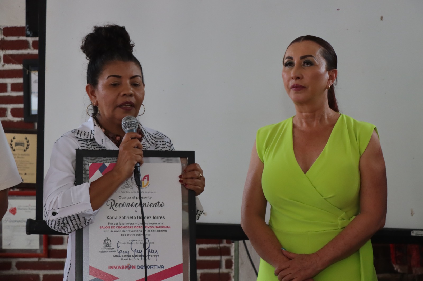 A la letra el galardón dice “El H Ayuntamiento de Villa de Álvarez otorga el presente reconocimiento a Karla Gabriela Gómez Torres. Por ser la primera mujer en ingresar al Salón de Cronistas Deportivos Nacional con 32 años de trayectoria en el periodismo deportivo colimense”.