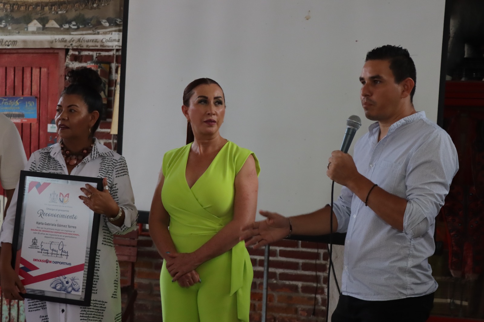 Acto seguido la alcaldesa entregó un reconocimiento a Karla Gabriela Gómez Torres por su ingreso al Salón de la Fama de los Cronistas Deportivos de México al ser la primera mujer de provincia en lograrlo.