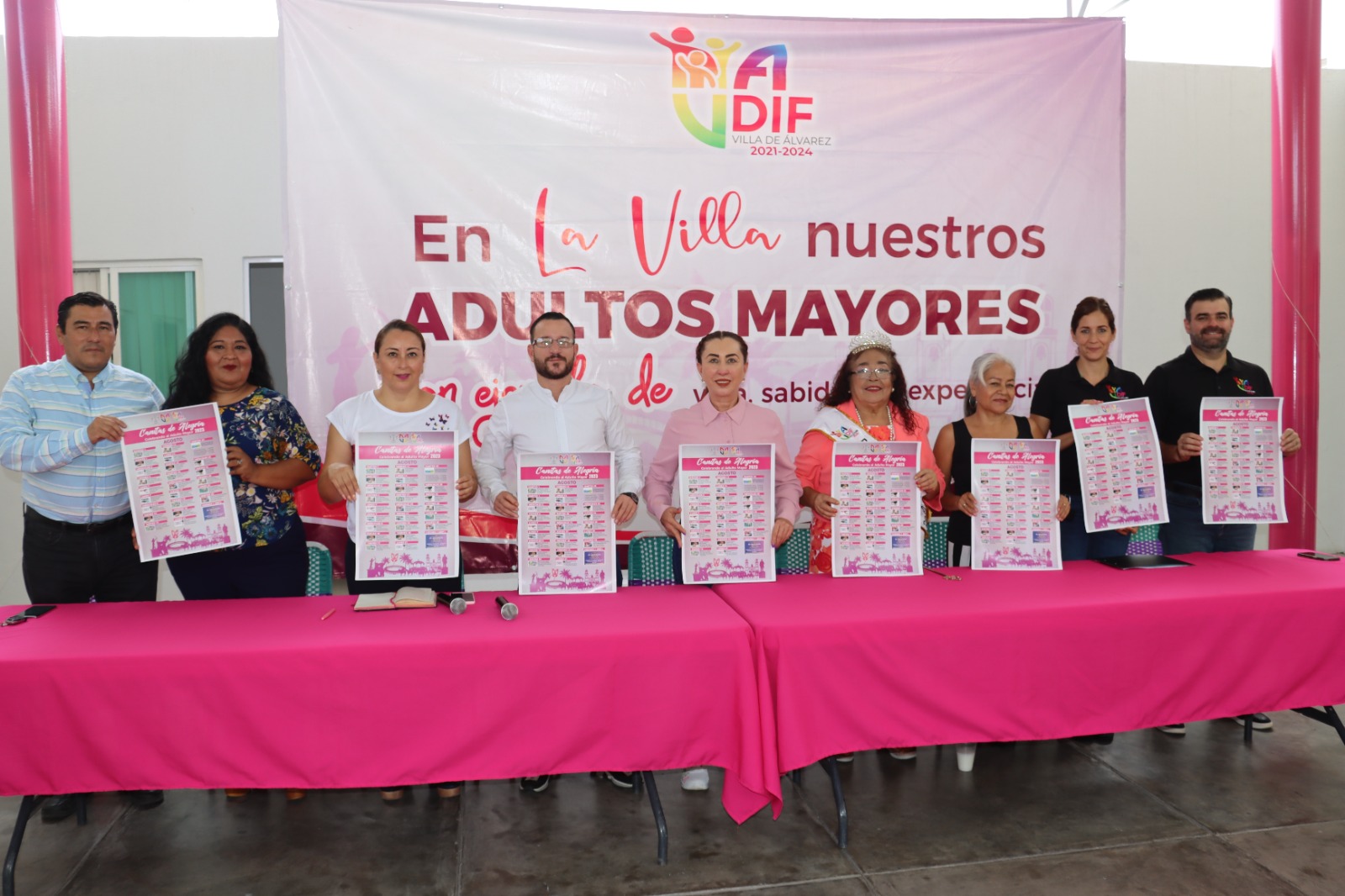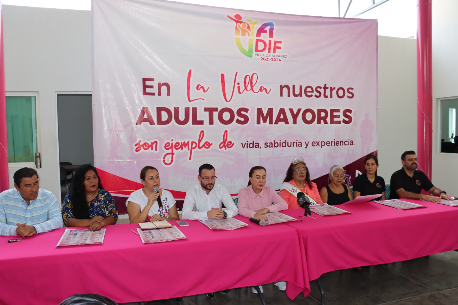 En la conferencia de prensa acompañaron a la Presidenta Tey Gutiérrez, el Presidente del Voluntariado del DIF Municipal, Alejandro Ruvalcaba; el Secretario del Ayuntamiento, Alfredo Chávez; la Directora del DIF Villa de Álvarez, Lizet Rodríguez, y las Reinas de las Personas Adultas Mayores, la saliente Rosa Delia y la entrante Micaela.