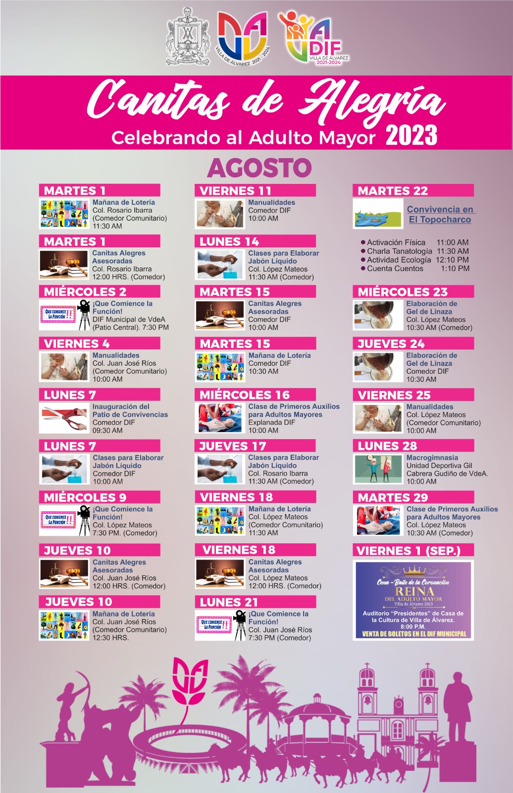 Asesorías jurídicas, charlas, proyección de películas y cursos de capacitación, son algunas actividades que el Ayuntamiento de Villa de Álvarez y el DIF Municipal realizarán el mes de agosto para celebrar a las Personas Adultas Mayores.