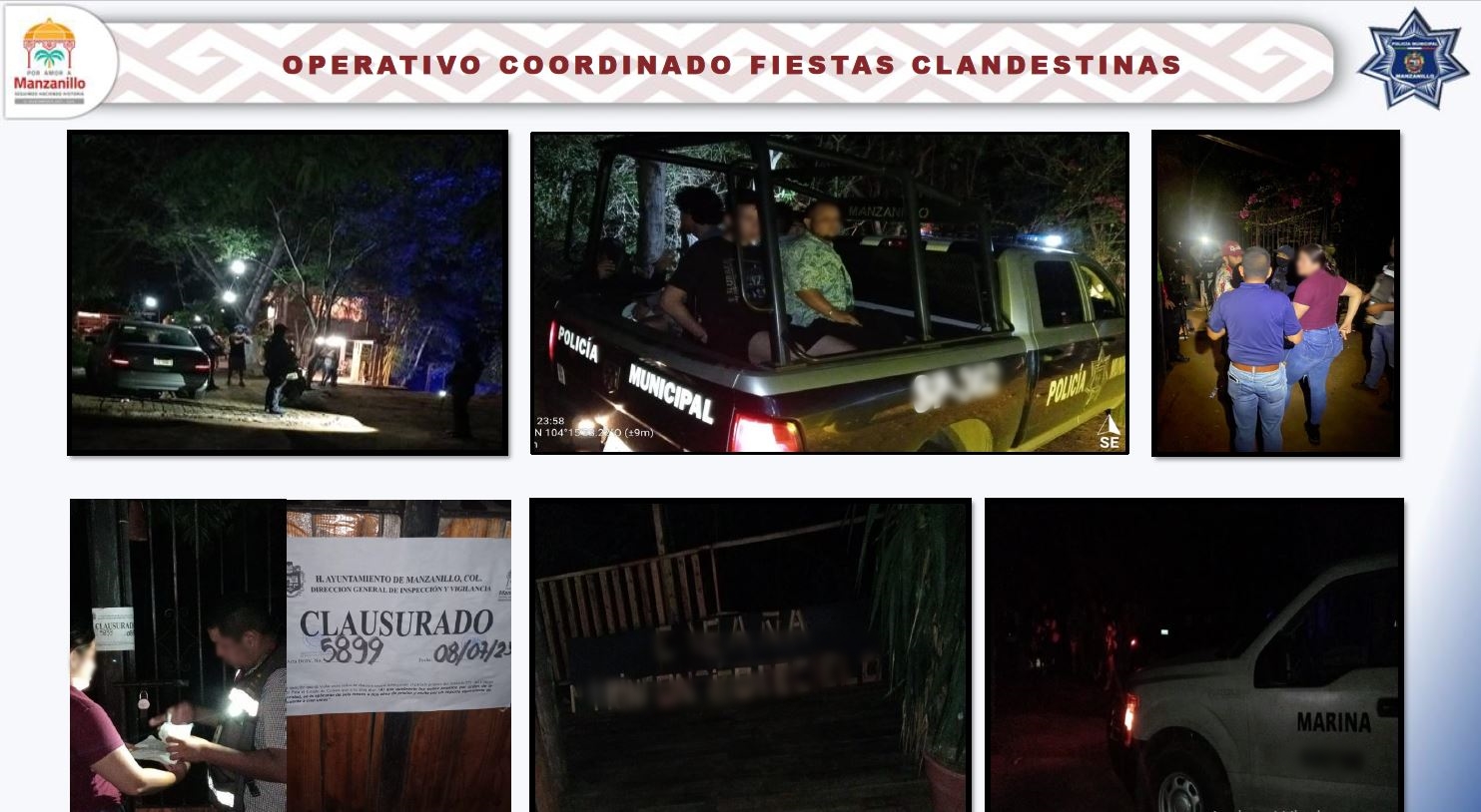 Derivado de denuncias ciudadanas relacionadas de fiestas clandestinas, elementos de la Policía Municipal en coordinación con personal de la Secretaría de Marina, de la Dirección de Inspección y Licencias del Ayuntamiento de Manzanillo, Guardia Nacional, Policía Estatal, SEDENA, Fiscalía General del Estado y Fiscalía General de la República, han llevado a cabo operativos coordinados, con el fin de prevenir la venta y consumo ilegal de bebidas alcohólicas y consumo de drogas a menores de edad en eventos clandestinos.