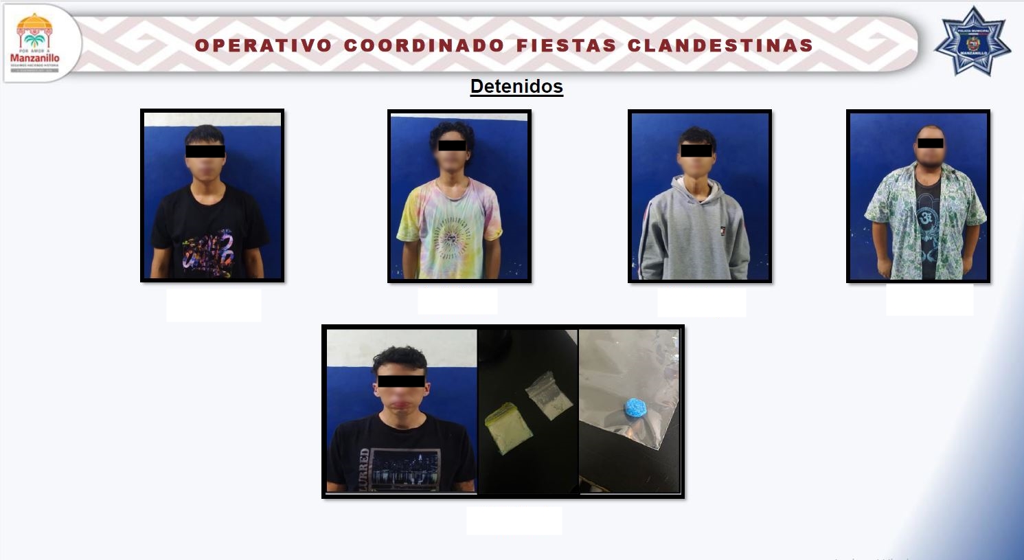 Logra Seguridad Pública de Manzanillo 5 detenidos y decomiso de dosis de droga en fiestas clandestinas