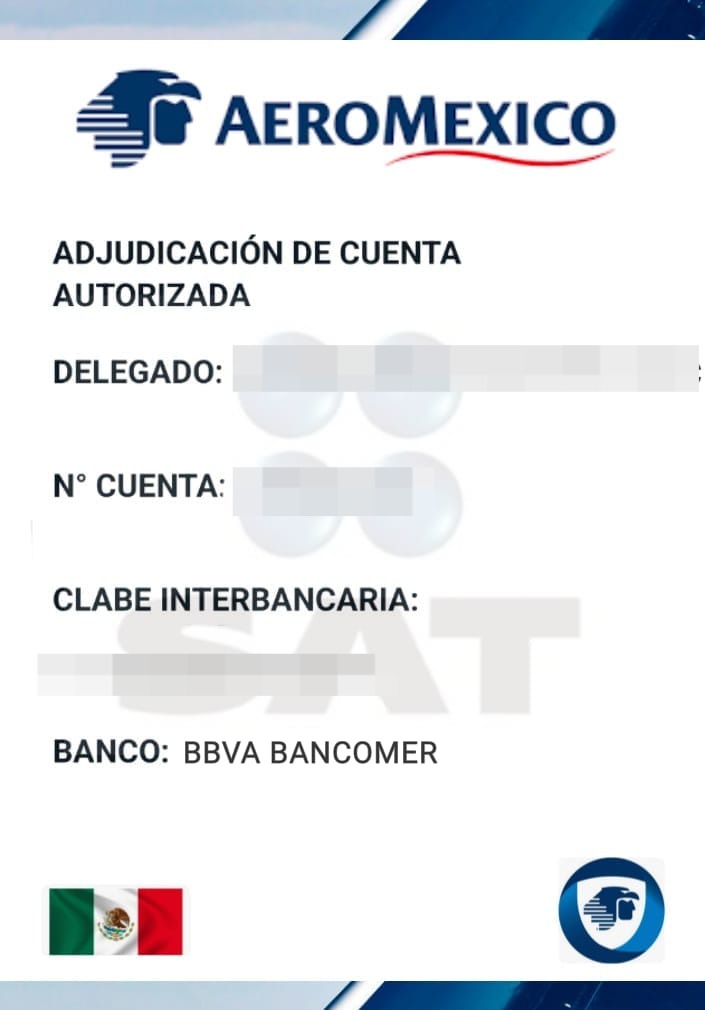 Le proporcionaron una ficha de pago que contenía la empresa Aeroméxico, una cuenta autorizada para el depósito perteneciente a BBVA Bancomer junto con el nombre del beneficiario. Ella proporcionó fotografías de su INE por ambos lados y de su tarjeta bancaria, ya que le mandarían 5,000 dólares para poder hacer el pago de la multa, el cual se iba a reflejar de 24 a 48 horas.