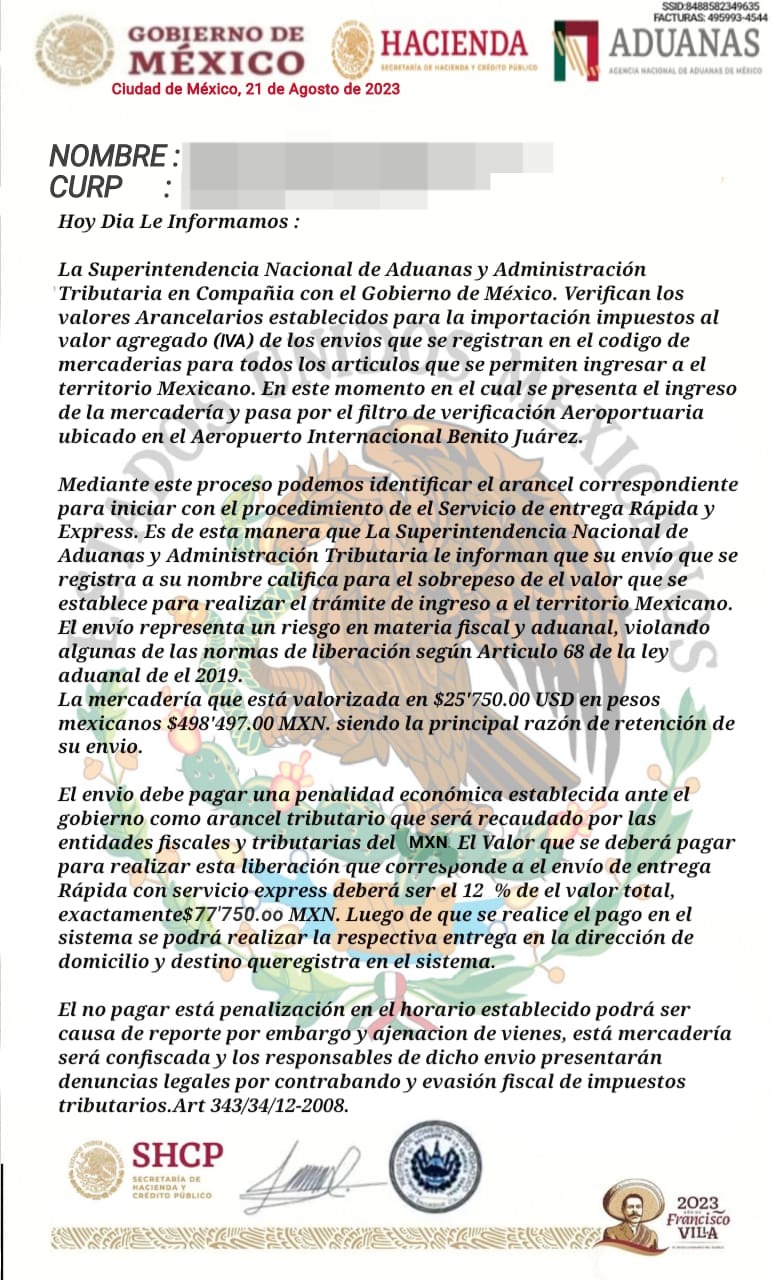 Después la contactaron por WhatsApp, pidiéndole que si podía recibir un paquete que venía de París porque no había nadie que se lo pudiera recibir, lo cual la víctima aceptó. El lunes pasado le llamaron de “Aeroméxico”, cobrando una multa que asciende a más de $77,000 porque el paquete excedía los límites permitidos; además el pago tenía que hacerse en territorio mexicano.