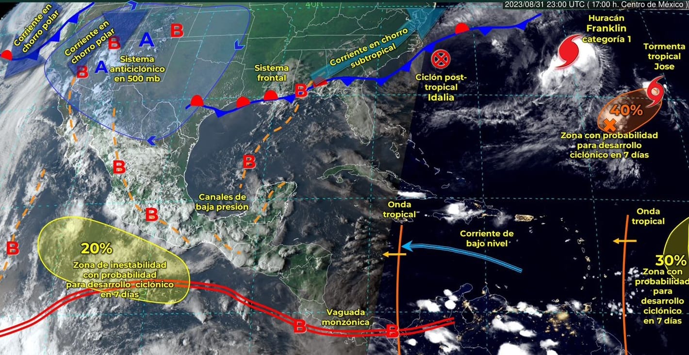 En el transcurso de la noche del jueves y madrugada de este viernes 1 de septiembre, un canal de baja presión extendido sobre el norte, centro y occidente de la República Mexicana ocasionará lluvias muy fuertes en Colima, Nayarit, Jalisco, Michoacán, Guerrero, Ciudad de México, Estado de México, Guanajuato, Campeche, Yucatán y Quintana Roo.