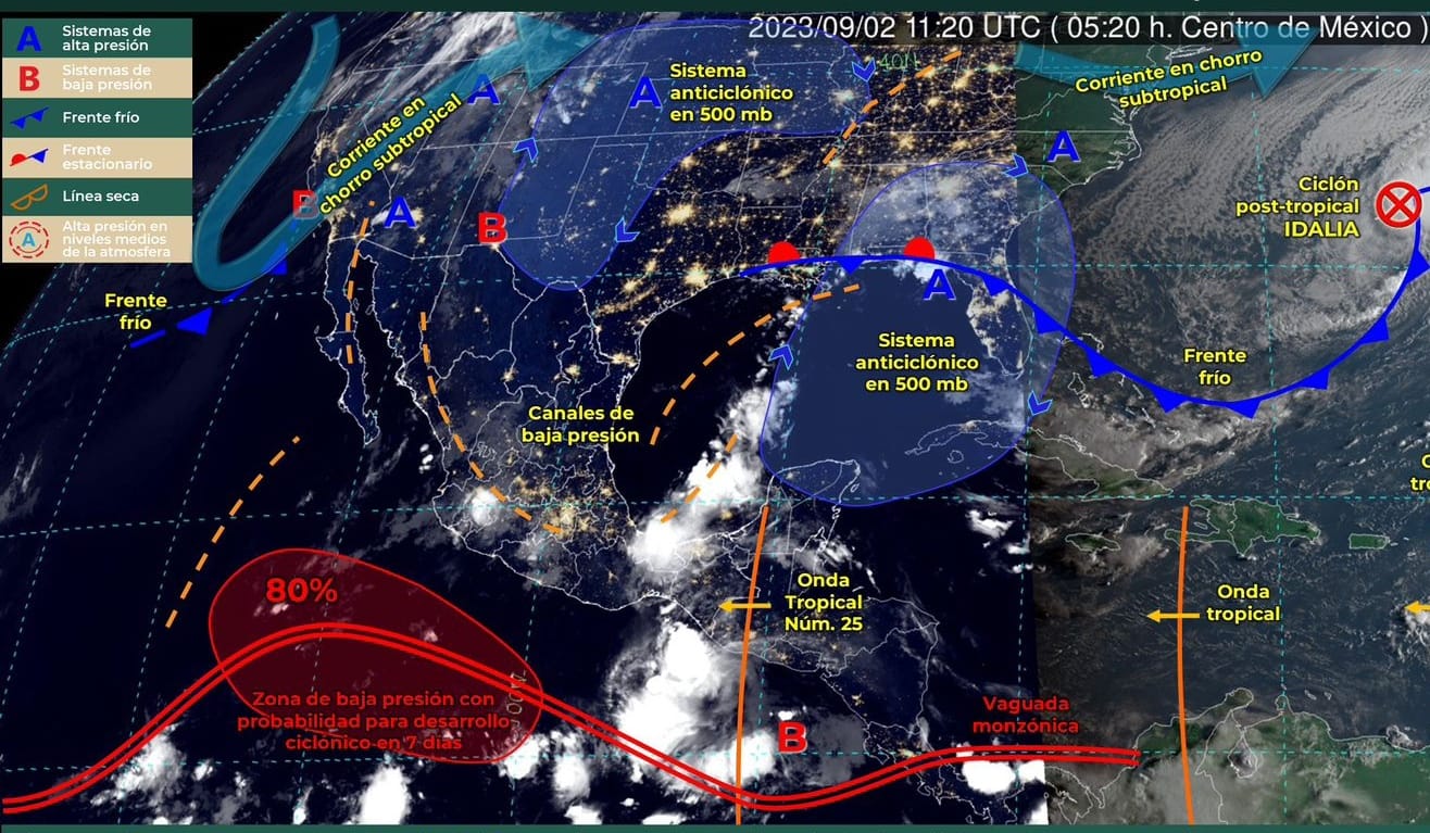 Hoy sábado 2 de septiembre, canales de baja presión al interior del país, aunado al avance de la onda tropical número 25 al sur de la Península de Yucatán, producirán lluvias fuertes en Colima, Sonora, Chihuahua, Nayarit, Jalisco, Michoacán, Guerrero, Estado de México, Morelos, Puebla, Campeche, Yucatán y Quintana Roo, así como lluvias muy fuertes a puntuales intensas en Veracruz, Tabasco, Oaxaca y Chiapas.