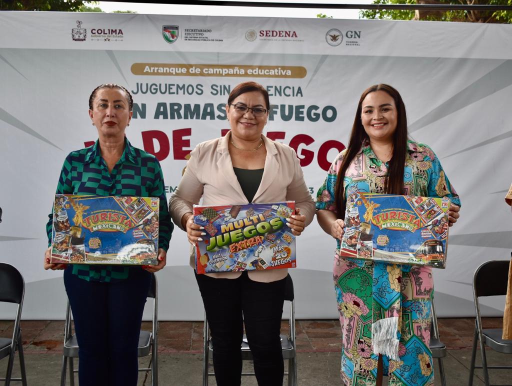 La secretaria general de Gobierno, Ma Guadalupe Solís Ramírez, acompañada de la presidenta municipal de Villa de Álvarez, Esther Gutiérrez Andrade, encabezó la tarde de este jueves la inauguración de la campaña denominada ‘Juguemos sin violencia: con armas de fuego ni de juego’ en su edición 2023, con el objetivo de fomentar el uso de juguetes y juegos lúdicos y evitar a toda costa los juegos bélicos entre las y los niños colimenses.