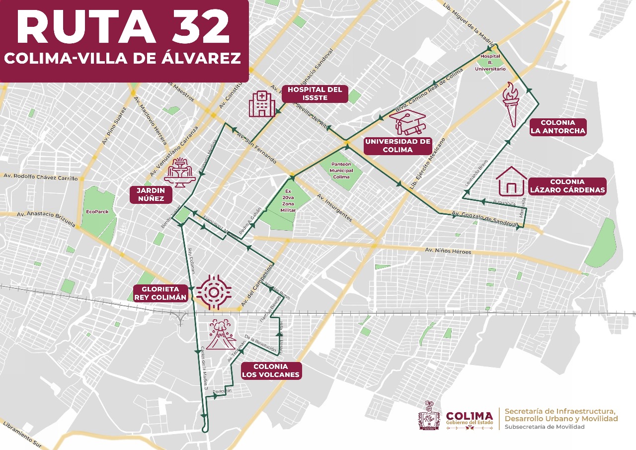 La nueva Ruta 32 es resultado de encuestas de origen y destino realizadas en las colonias Antorchista, Las Torres, Riveras del Jazmín, Francisco Villa y Los Volcanes; desempeñará un papel fundamental al conectar estas colonias con sus destinos principales, incluyendo la Universidad de Colima y el centro histórico de Colima. La frecuencia será de un autobús cada 29 minutos, garantizando un servicio eficiente y accesible.