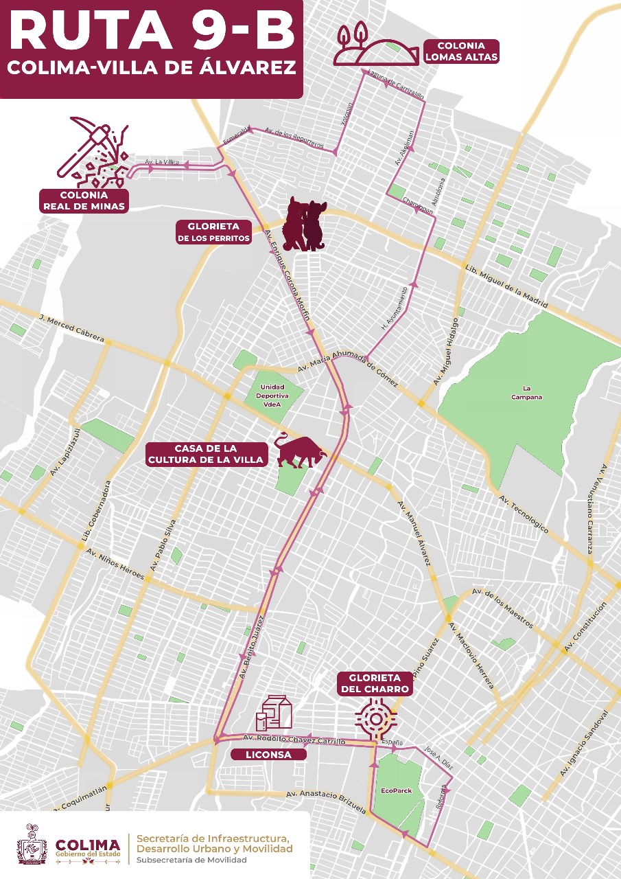 La Ruta 9-B surge tras un análisis de encuestas aplicadas en la colonia Real de Minas, beneficiando también a la colonia Montellano en Villa de Álvarez; proporcionará conectividad desde la colonia Real de Minas hacia sus destinos principales, que incluyen el centro de Colima y la tienda Soriana. Ofrecerá servicio con una frecuencia de un autobús cada 24 minutos.