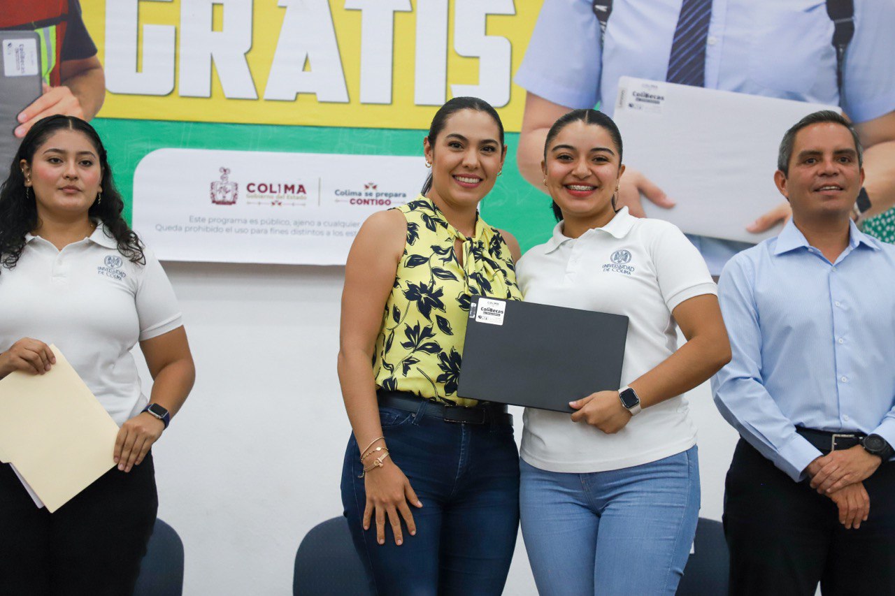 La gobernadora Indira Vizcaíno Silva sigue recorriendo los diez municipios para entregar a estudiantes de primer grado de secundaria, así como de licenciaturas e ingenierías de escuelas públicas, el programa ColiBecas Computadoras; este miércoles asistió a Manzanillo, donde 1,705 alumnas y alumnos de cuatro secundarias y diez carreras profesionales de la Universidad de Colima recibieron sus equipos gratuitos.