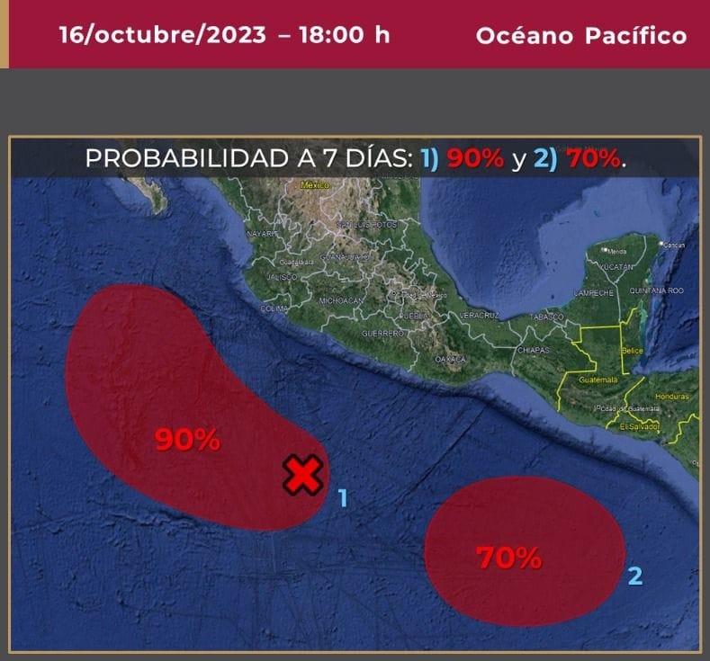 El Servicio Meteorológico Nacional (SMN) indicó que, para este martes, la zona de baja presión con alta probabilidad de desarrollo ciclónico o posible ciclón tropical se localizará al sur de las costas de Colima y Jalisco, sus desprendimientos nubosos incrementarán la probabilidad de lluvias puntuales fuertes a muy fuertes en el occidente y sur del país, con puntuales intensas de hasta 150 milímetros en Colima, sur de Jalisco, Michoacán y Guerrero.