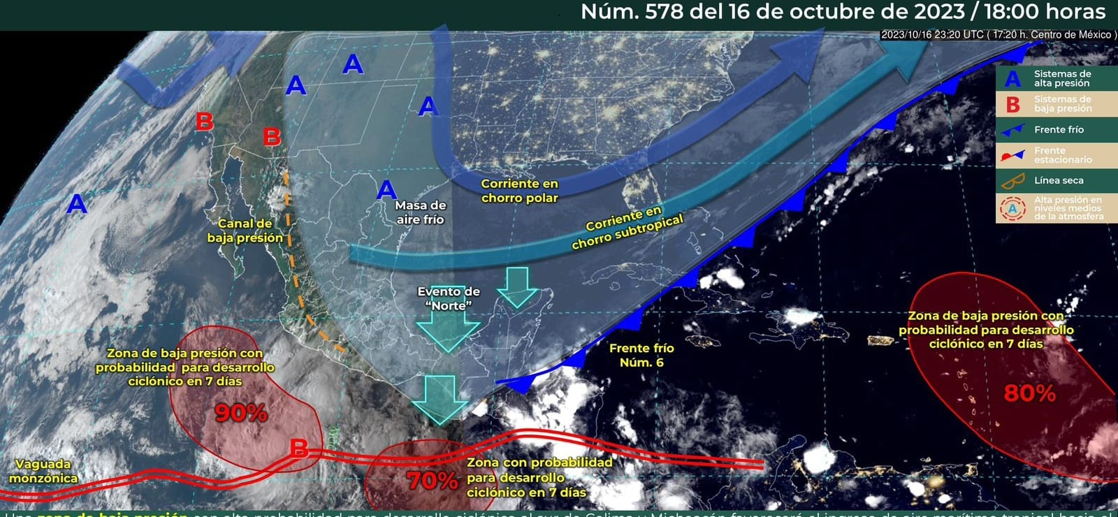 Durante las próximas horas, una zona de baja presión con alta probabilidad para desarrollo ciclónico se localizará al sur de Colima y Michoacán, y favorecerá el ingreso de aire marítimo tropical hacia el occidente de la República Mexicana.